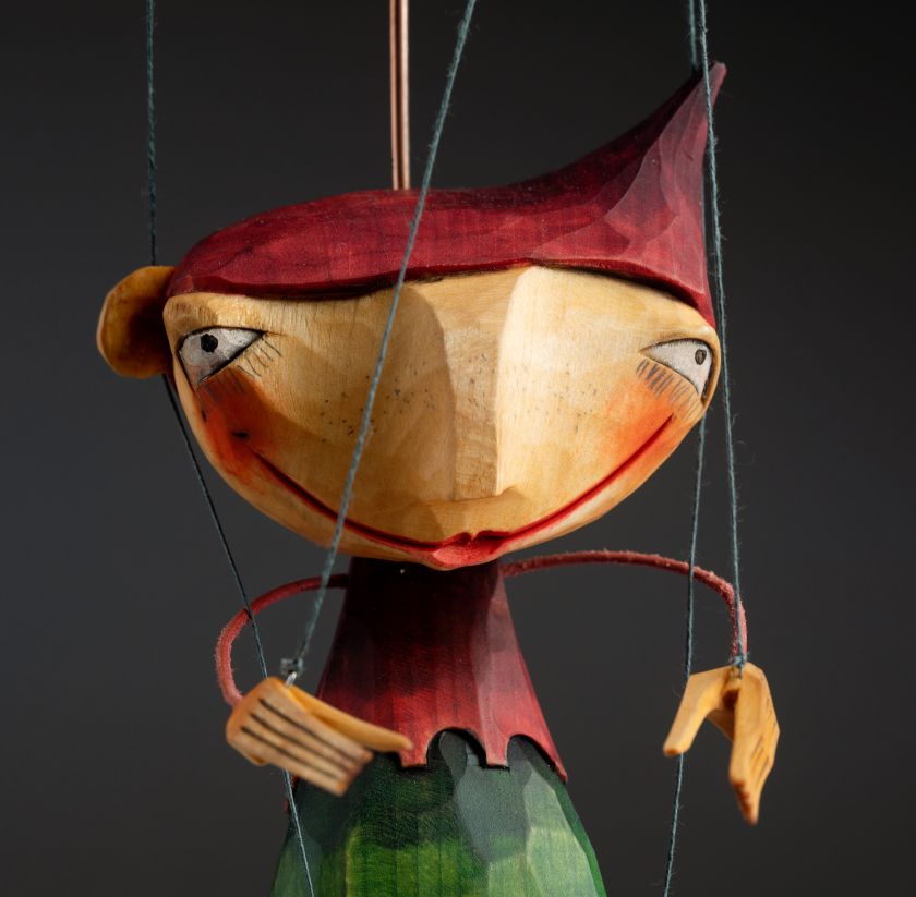 Hravý skřítek - dřevěná vyřezávaná loutka