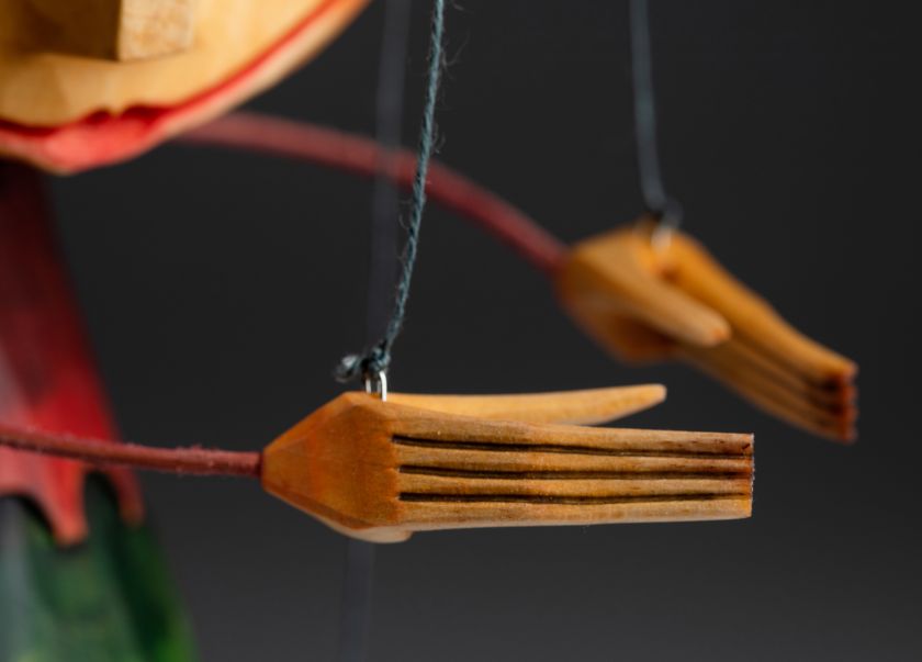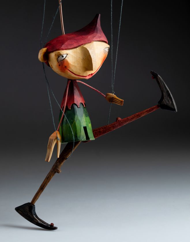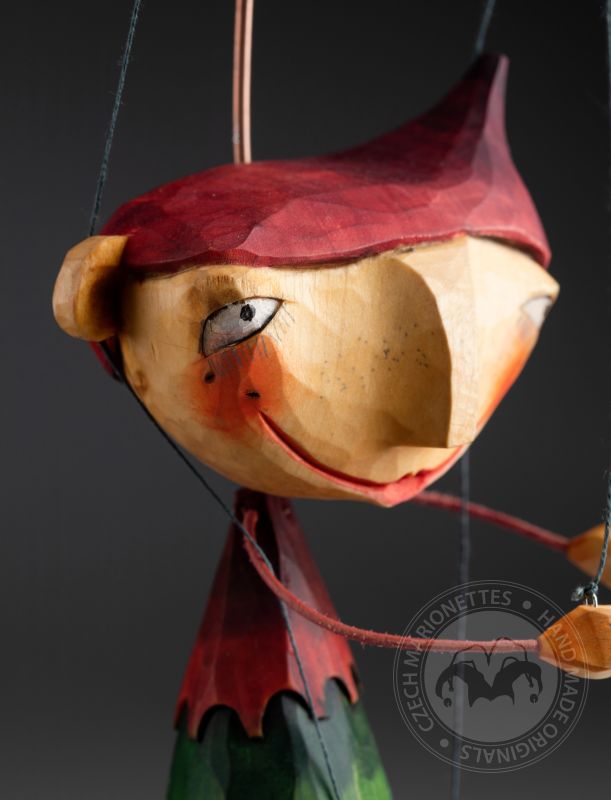 Tato loutka skřítka má dvě verze. Každá je jiná, každá má svůj jedinečný a osobitý vzhled. Skřítci jsou ručně vyřezaní a namalovaní řezbářem a loutkářem Martinem Kadlecem, který ve svých loutkách kombinuje klasické řemeslo s moderním pojetím umění.