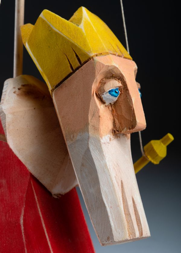 Ručně vyřezávaná a masová tyčová loutka krále. Báječná dekorativní figurka či originální dárek.