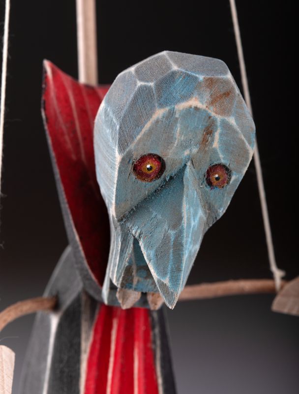 Tato ručně vyřezávaná dřevěná loutka má jedinečný, hrubě tesaný design s výraznou modrou hlavou a rudýma očima.  Ideální jako sběratelský kousek, dekorace nebo pro milovníky tradičního loutkářství.