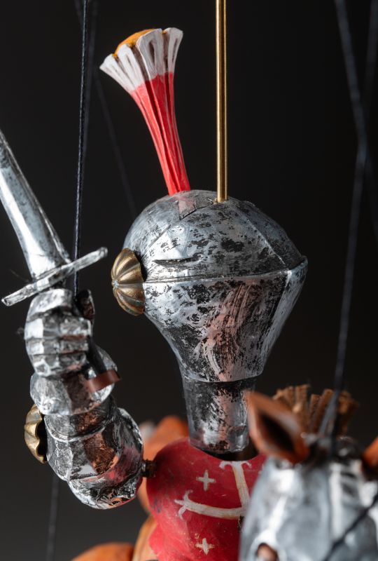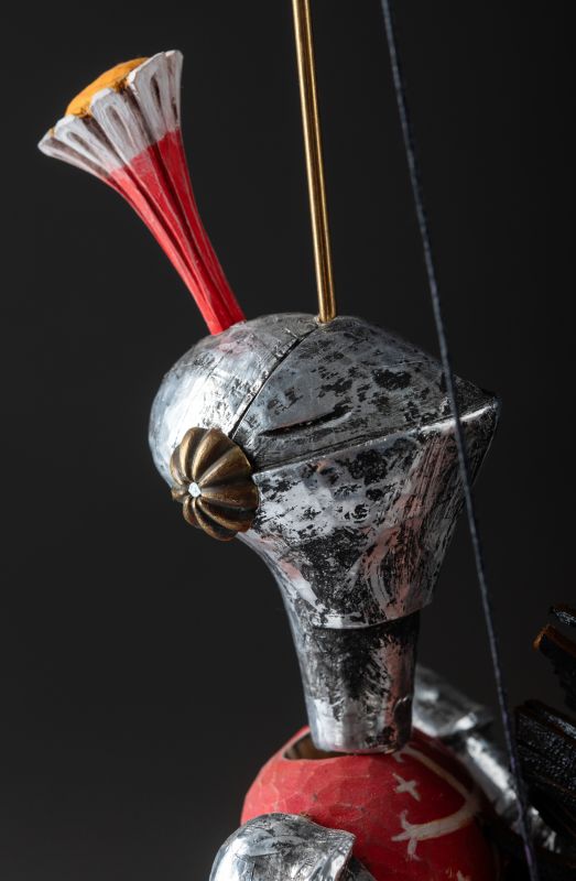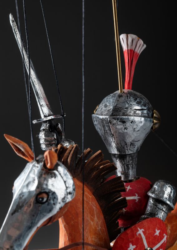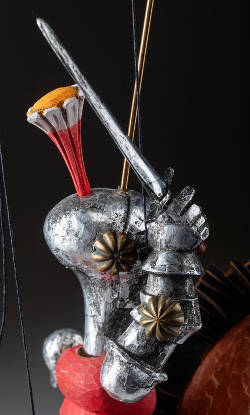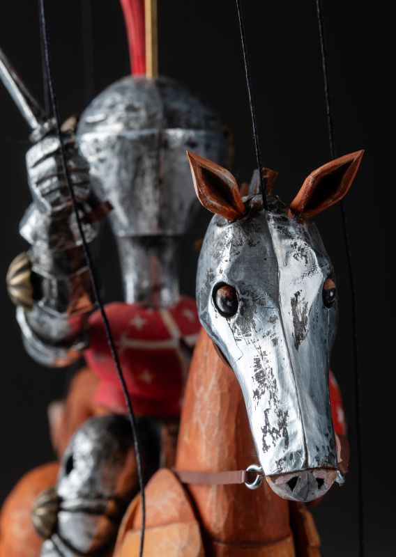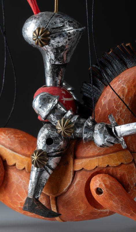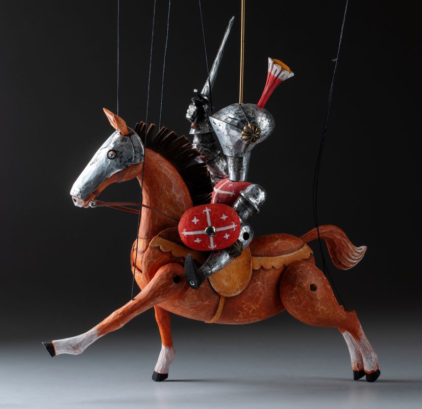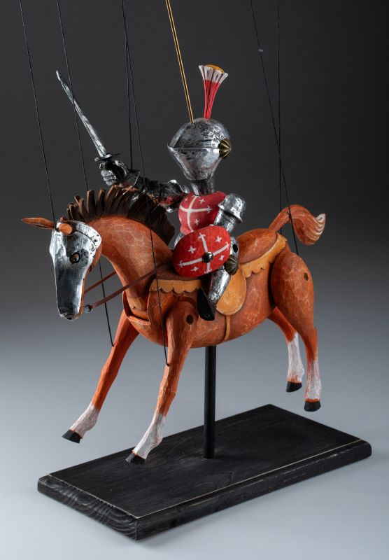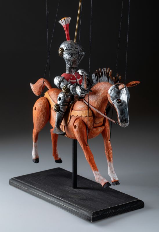 Tato nádherně vyřezávaná loutka oživuje legendu středověkých rytířů. Oblečený do detailního brnění, vyzbrojený mečem a štítem, Knight Rider se řítí vpřed na svém ušlechtilém oři. Mistrovská řezbářská práce zachycuje sílu a dynamiku boje pomocí propracovaných detailů, kovových prvků a výrazného pohybu. Díky plné artikulaci je tato loutka ideální pro sběratele, divadelní představení nebo jako působivý dekorativní prvek.