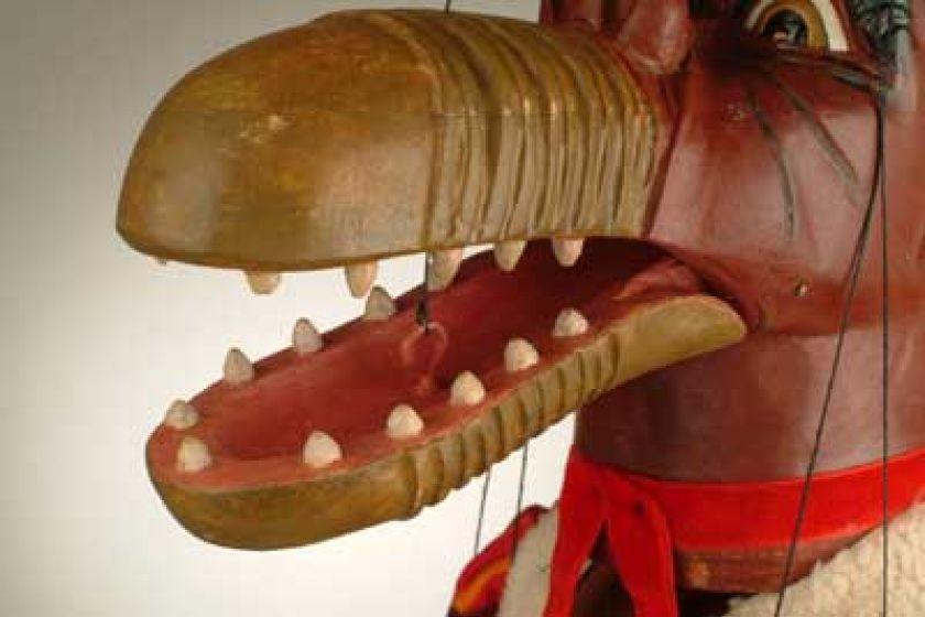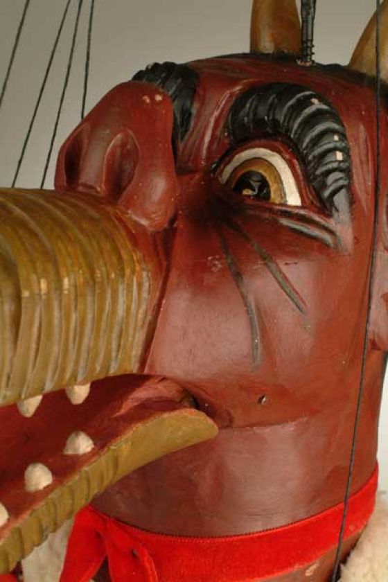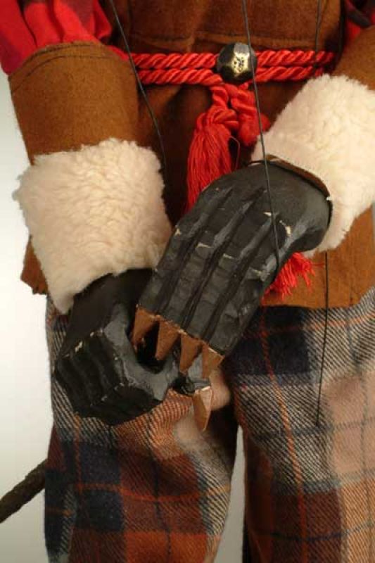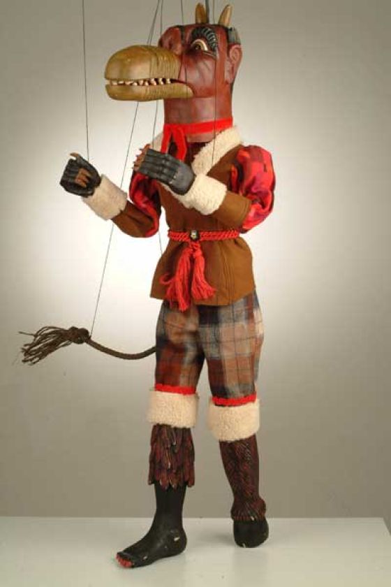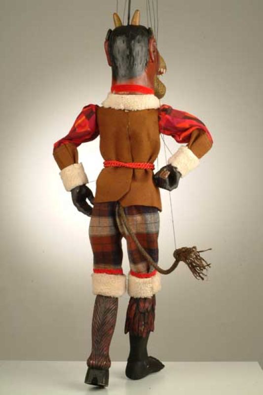 Tato starožitná loutka z 19. století má mnoho originálních detailů. Má pohyblivou čelist, řadu zubů v puse, drápy na rukou a místo jedné nohy samozřejmě kopyto. Čertovy kostkované kalhoty zdobí kožíšek, na sobě má kabát s krásnými zdobenými rukávy a nesmí mu chybět ocas.