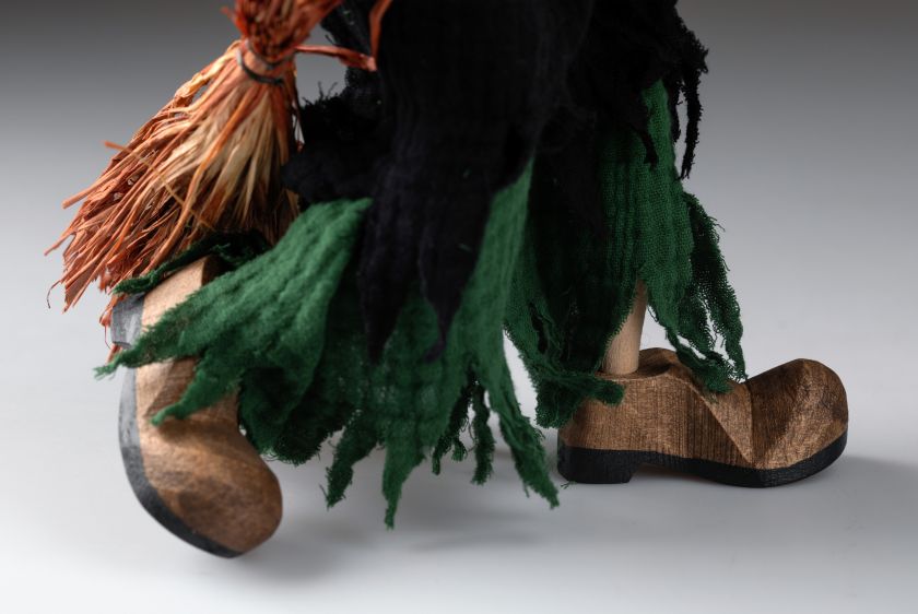 Das Skelett ist aus Holz geschnitzt, der Kopf und die Hände sind aus stoßfestem Harz gegossen, Beine und Schuhe sind handgeschnitzt und poliert. Ihr Gesicht ist handbemalt und ihre Kleidung ist handgenäht.