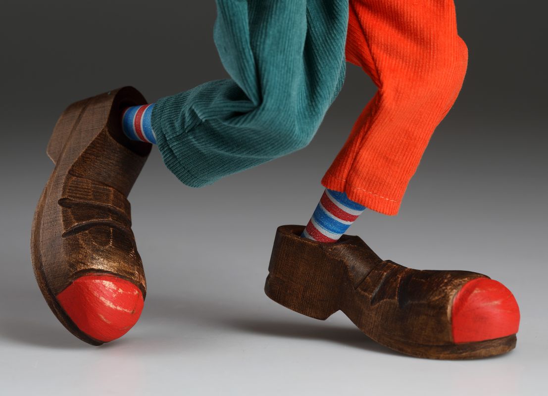Der Clown ist im klassischen Stil gefertigt. Der Kipphebel ist komplett aus Holz. Das Skelett besteht aus Holz, der Kopf und die Handflächen sind aus ungefährlichem und schlagfestem Harz gegossen, die Beine und Schuhe sind geschnitzt und geschnitten, das Gesicht ist handbemalt. Nase und Hut sind ebenfalls aus Holz.