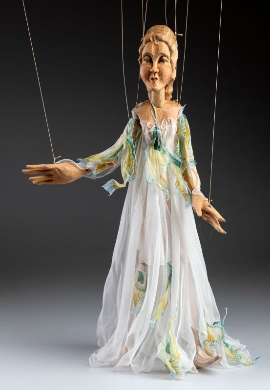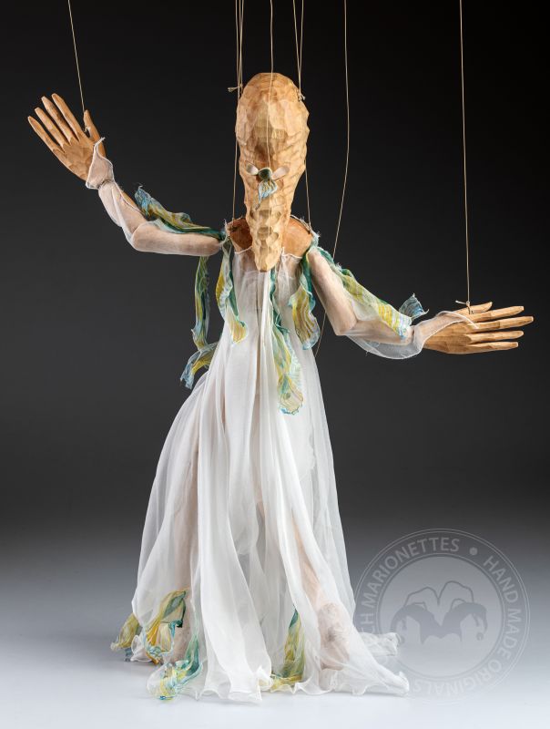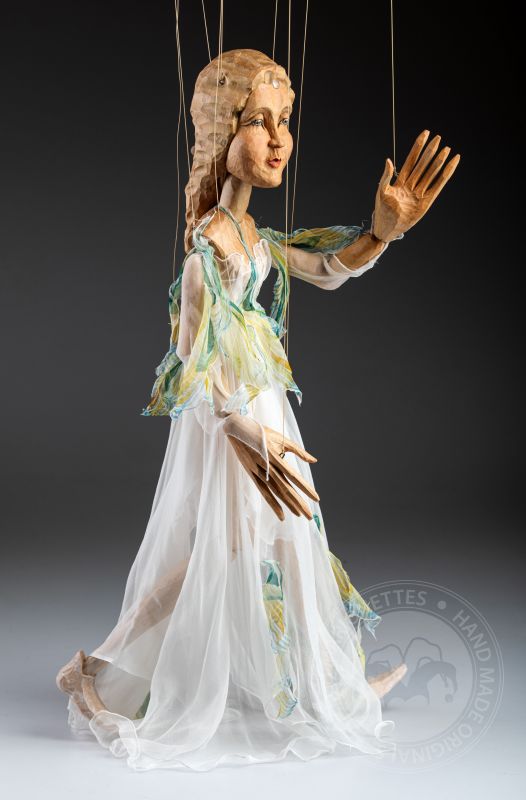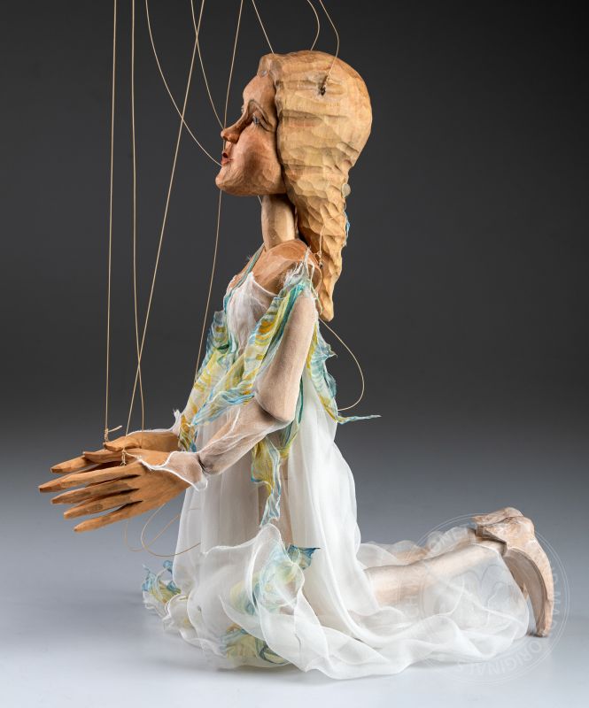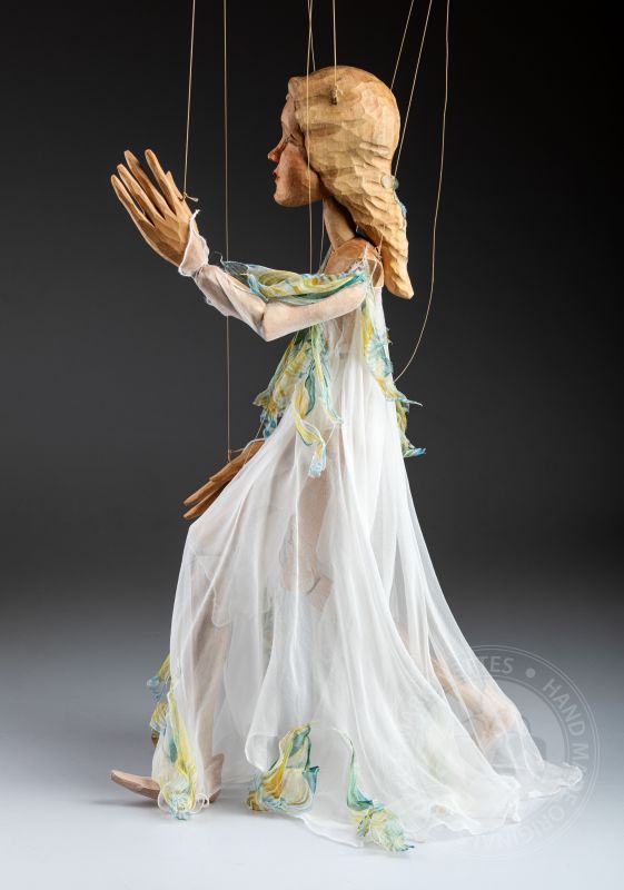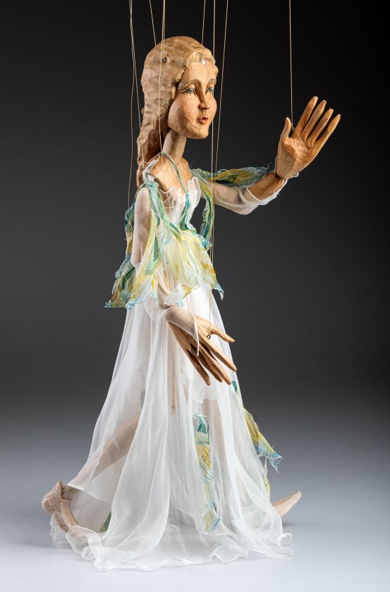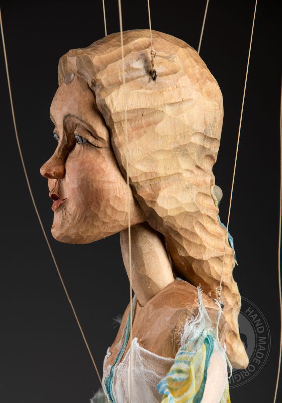 Die Marionette „Morgentau“ ist 65 cm groß, sie wurde liebevoll von Lenka Pavlíčková aus feinstem Lindenholz geschnitzt und in Bienenwachs konserviert. Sie liebt es, ihre Marionetten mit Ölfarbe zu bemalen, da sie die natürliche Maserung des Holzes schön durchscheinen lässt.