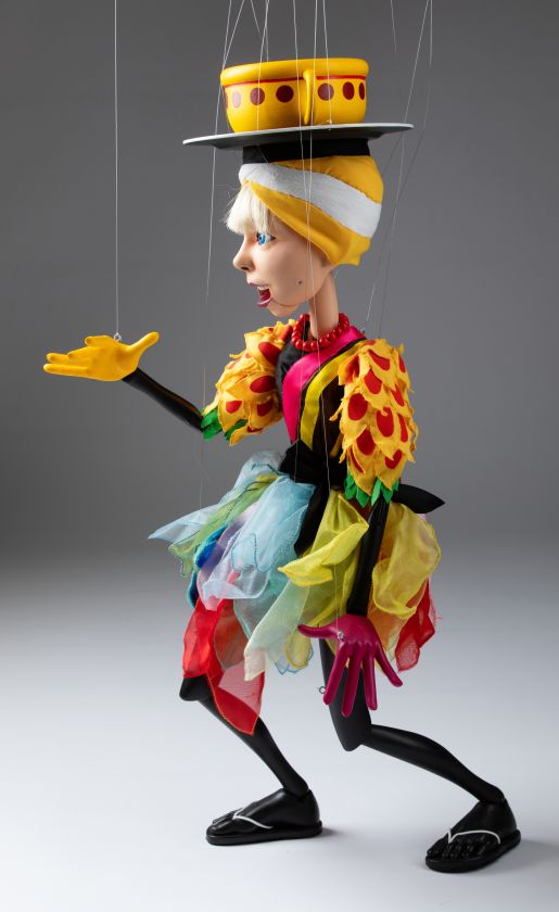 Gekleidet in eine kühne Mischung aus leuchtenden Stoffen, geschichteten Texturen und verspielten Accessoires, ist diese Marionette eine Hommage an Annie Cordys unvergessliche Auftritte. Sie wurde für fließende, ausdrucksstarke Bewegungen entworfen und ist perfekt für Sammler, Theaterliebhaber oder alle, die ihre außergewöhnliche Karriere bewundern.