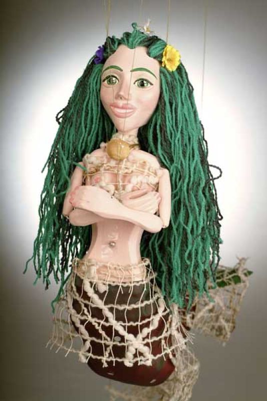 Ihre grünen Augen sind voll von Verspieltheit, langes grünes Haar schmücken kleine Blümchen und sogar gewölbte Augenbraue erinnert durch ihre Farbe ans Meer. Ihre Röcke sind aus Fischernetzen gemacht. Meerjungfrau hat den Körper aus Holz ausgeschnitzt. Gesicht und Hände sind aus Mramorit gegossen und dann handbemalt.