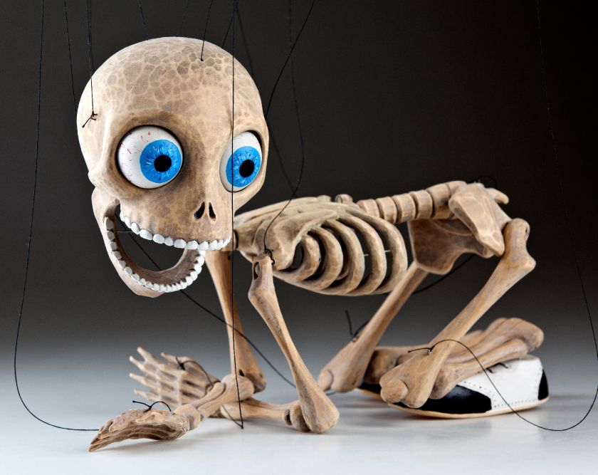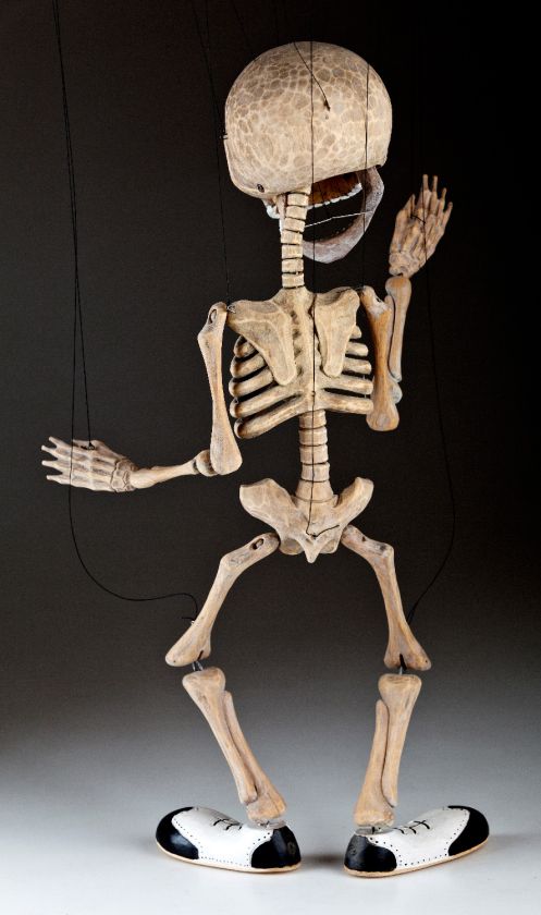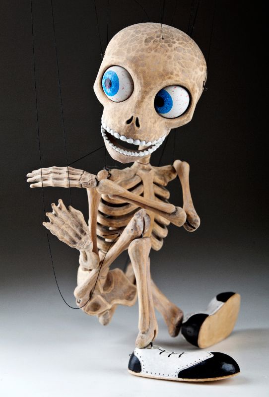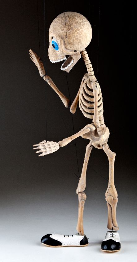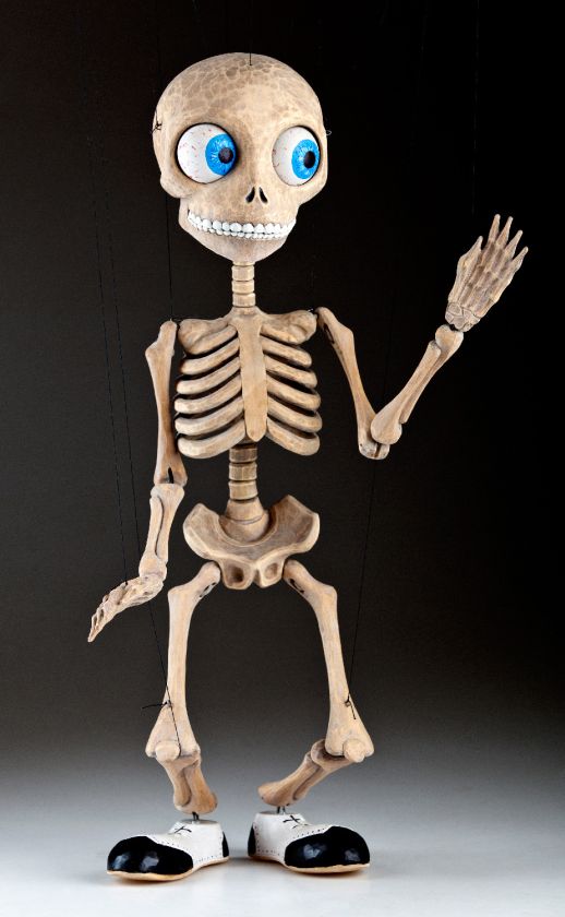 Die einzigartige Schnitztechnik und die ungewöhnlichen stilisierten Comic-Merkmale eines Skeletts unterscheiden sich von der Herstellung anderer Puppen. Sein Mund mit schönen Zähnen und seitwärts bewegten Augen, ausdrucksstarkes Malen und seine Fähigkeit, sich in spielerische und freche Positionen zu bewegen, sorgen dafür, dass Sie stundenlang Spaß daran haben können, mit diesem wunderbar vielseitigen Skelett zu spielen oder aufzutreten.