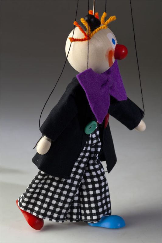 Er ist aus Holz hergestellt, die Kleidung ist handgenäht und bis ins kleinste Detail ausgearbeitet. Sein Gesicht ist mit den gesundheitsunschädlichen Farben bemalt und sein Haar ist aus der Wolle. Die Marionette hat profesionelles Spielkreuz, an welchem die Führungsfäden befestigt sind.
