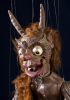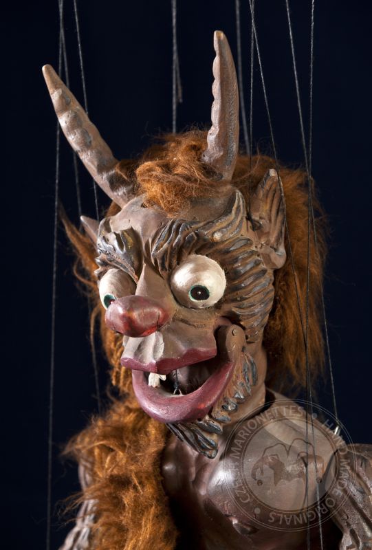 Diese Marionette ist wirklich einzigartig. Ihr ganzer Körper ist bis ins Detail aus Lindenholz geschnitzt, und der einzige textile Schmuck, den sie trägt, ist ein Pelzmantel, der das Haar darstellen soll, das dem Teufel über den Körper wächst. Aus seinem Schwanz wächst auch ein Stück Fell, mit dem der Teufel oft dargestellt wird. Seine Originalität wird durch den beweglichen Kiefer und die großen Kulleraugen noch verstärkt. Kurzum, ein Original, das jeden Puppenliebhaber begeistern wird.