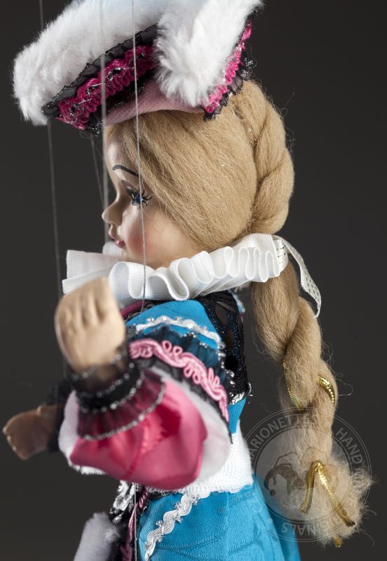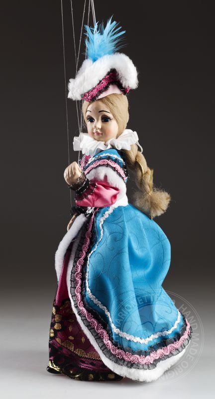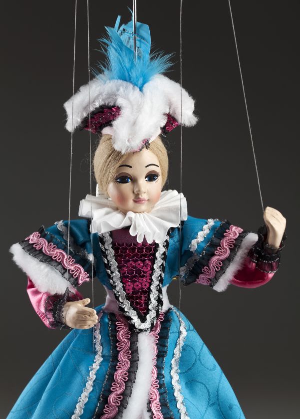 Die kleine Gräfin sieht unwiderstehlich aus! Klara ist eine echte Frau. Er kann sich immer perfekt anziehen und die Accessoires wunderbar kombinieren. Ihr Haar ist zu einem richtigen Zopf zusammengebunden und ihr Make-up entspricht der neuesten Mode. Das Kleid ist maßgeschneidert und bis ins kleinste Detail dekoriert. Wenn Sie Mode, dekorative Puppen und einen sanften Look mögen, wird Sie die Puppe der Gräfin Klara verzaubern. Auf den Fotos können Sie sehen, wie schön es im Innenraum aussieht!Marionetten wie die Gräfin Klara werden in wenigen Stück in limitierten Auflagen hergestellt. Kopf, Arme und Beine sind gegossen und handbemalt, der Körper (Skelett) besteht aus Lindenholz. Die Marionette hat eine traditionelle Spielkreuz, sie ist über einen Draht mit der Steuerung verbunden und klassische Fäden werden zur Steuerung von Händen und Füßen verwendet.Schauen Sie sich die schöne und detaillierte Arbeit an einem schönen maßgeschneiderten Kostüm an. Es besteht aus hochwertigen Stoffen mit einem Schwerpunkt auf präziser Verarbeitung. Hohe Dekoration ist absolut typisch für diese Kollektion.