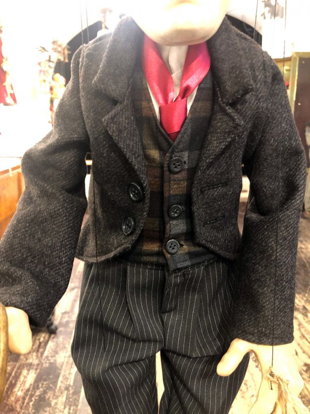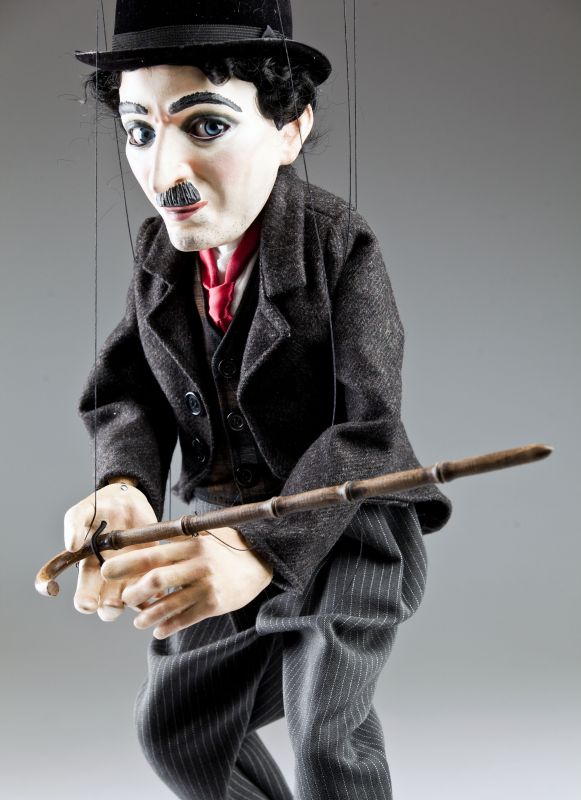 Diese Marionette des berühmten Charlie Chaplin ist in kleinsten Details ausgearbeitet und hat ihren eigenartigen Stil und Zauber. Sein klassischer Schwarzanzug ist sorgfältige Handarbeit, sowie sein Hemd, Krawatte, Hut und notwendiges Stöckchen. Diese Marionette ist im klassischen Stil angefertigt, einschließlich der professionellen Führungsvorrichtung an welcher die Bewegungsfäden befestigt sind.