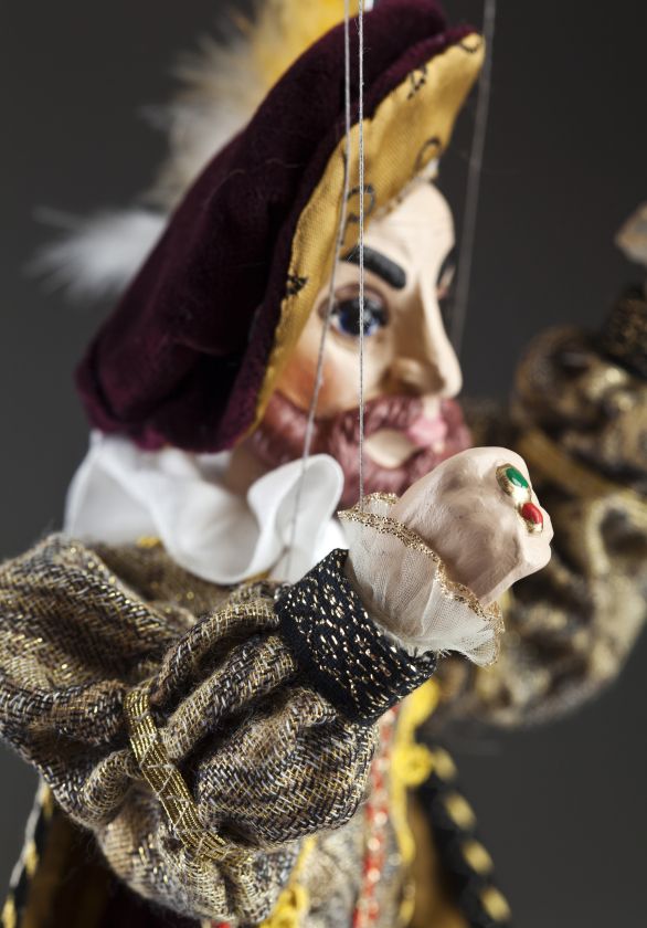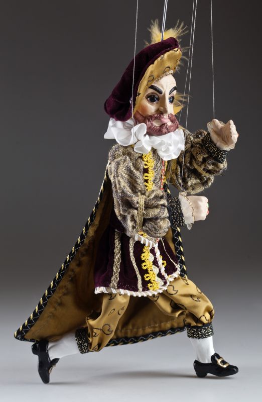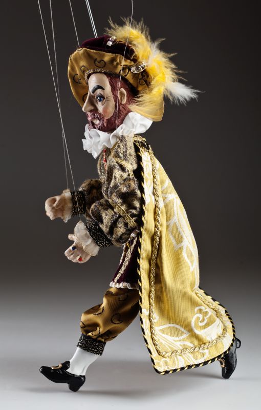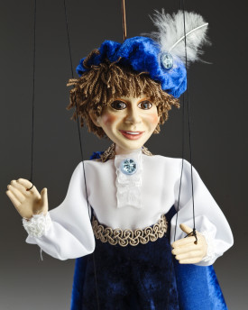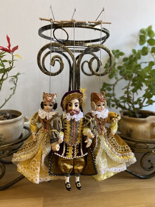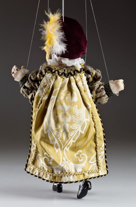 Die Puppe hat eine traditionelle Steuerung, sie ist mit einem festen Draht mit dem Spielkreuz verbunden und klassische Fäden werden zur Steuerung von Händen und Füßen verwendet.Schauen Sie sich die schöne und detaillierte Arbeit an einem schönen maßgeschneiderten Kostüm an. Es besteht aus hochwertigen Stoffen mit einem Schwerpunkt auf präziser Verarbeitung. Hohe Dekoration ist absolut typisch für diese Kollektion. Dank des Könnens des Puppenspielers wurde dieses schöne Stück geschaffen.