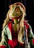 The whole marionette is carved from linden wood, including the face, eyes and shoes. The water spirit's costume is made of various types of textiles, his red vest contrasts beautifully with the green color of his pants. Also notice the webs that are visible between his fingers. With its astonished expression, it is a truly original historical piece.
