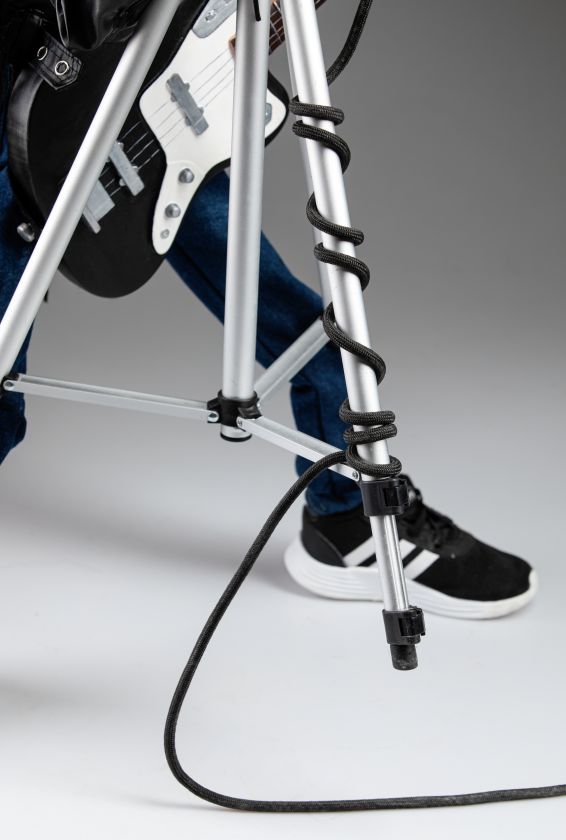 The mechanism for operating this marionette is not just strings. You use a special cross on the back of the puppet's head to make him open and close his mouth and move his head around. The hand playing the guitar is attached to a string and a wooden bar. The legs are part of a  special stand so you can move the puppet by moving the stand itself.