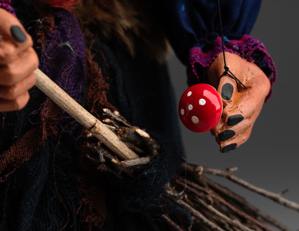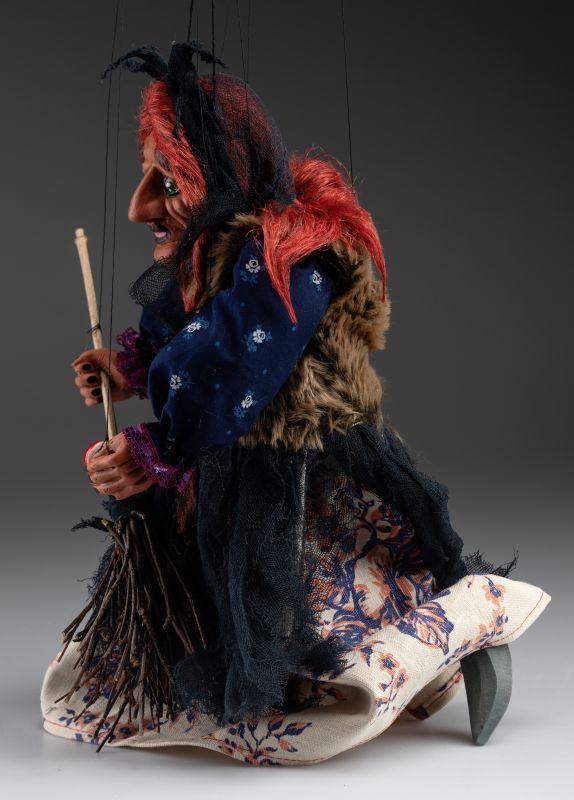This witch is a classic string puppet with a hand-painted face and body and hand-made clothes full of amazing details.