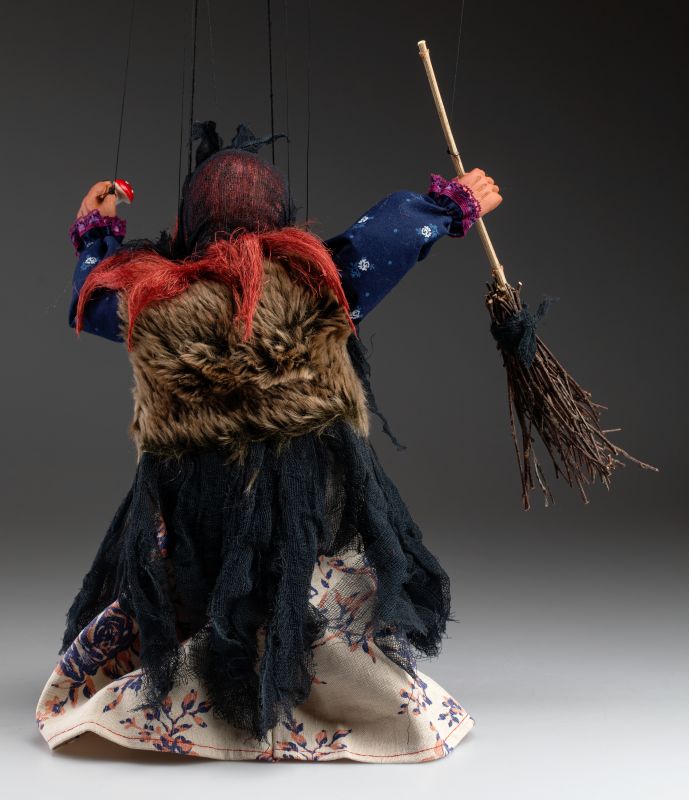 This marionette of a witch has all the aspects of a classic Czech marionette puppet. She is handmade, hand-painted and her costume is hand-sewn. You can notice plenty of amazing details like different color fabrics, beautiful vibrant red hair, or her broom and a little cute mushroom she's holding.
