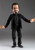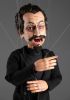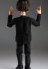 This marionette was made as a custom order. The client wanted elegant, dark hair and a little scary devil all in black. Well, there he is. This marionette has a movable mouth. He's all hand-painted, and his clothes and hair are hand-made.