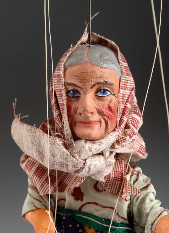 This antique grandmother puppet is dressed in beautiful traditional attire and represents a character deeply rooted in Czech tradition. Every detail, from the scarf to the patterned apron, has been carefully crafted to capture the essence of Czech folk art. The puppet belongs to a collection of authentic Czech marionettes and is a testament to the master craftsmanship passed down from generation to generation.