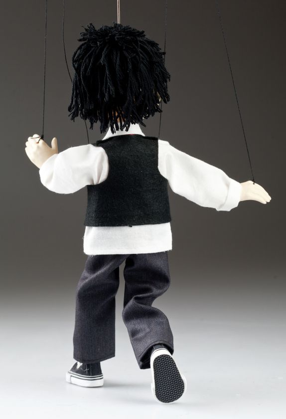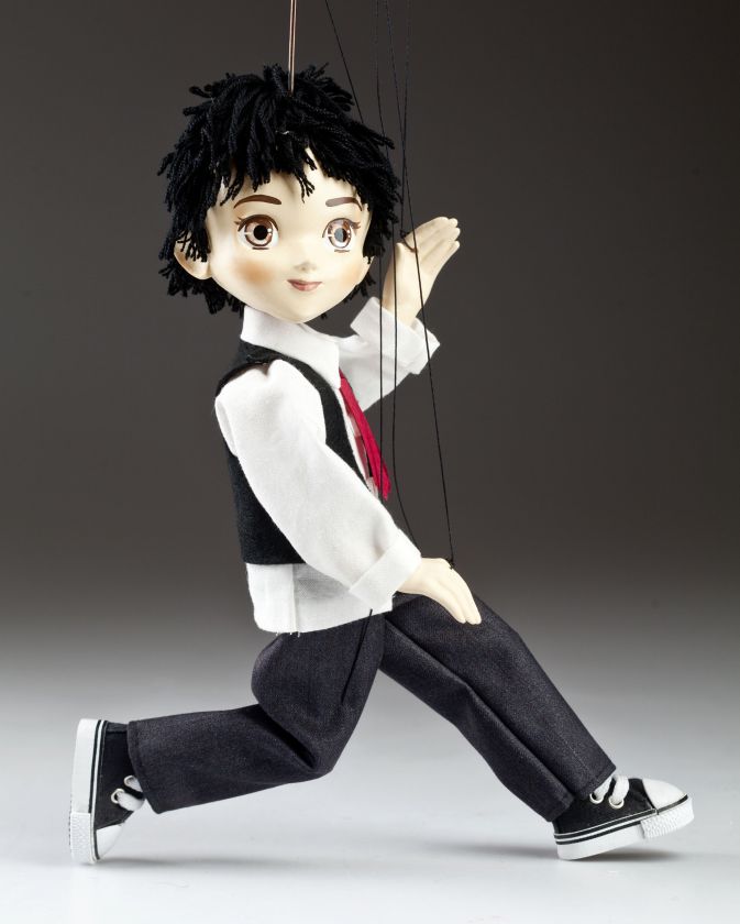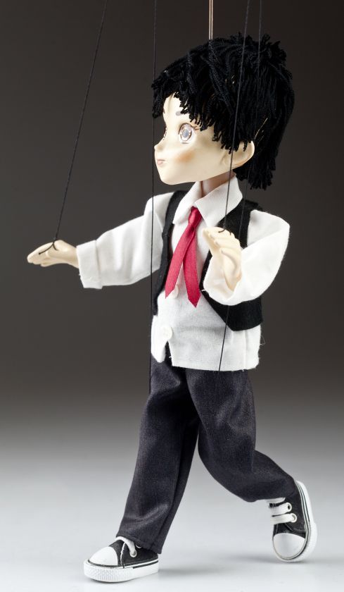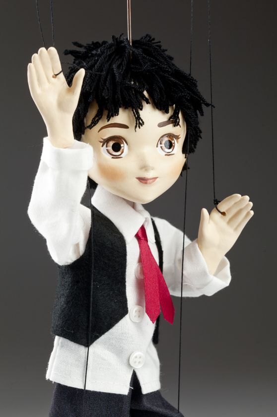 The boy's puppet is made in small series. Some parts of his body are cast from special resin, other parts turned from wood. It is hand-painted by experienced painters and the garment is sewn by clever seamstresses. The puppet is moderately movable, easy to use, connected to a classic puppet-controller.