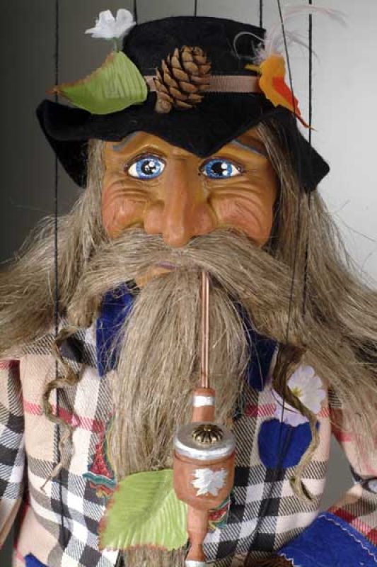 This marionette is actually a traditional rendition of Krakonoš, a Czech folklore figure. Krakonoš is the Father of the Woods and has mystical god-like powers.