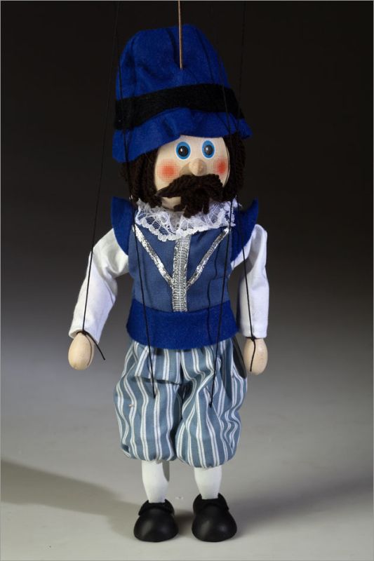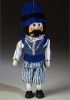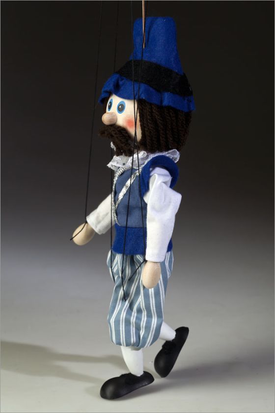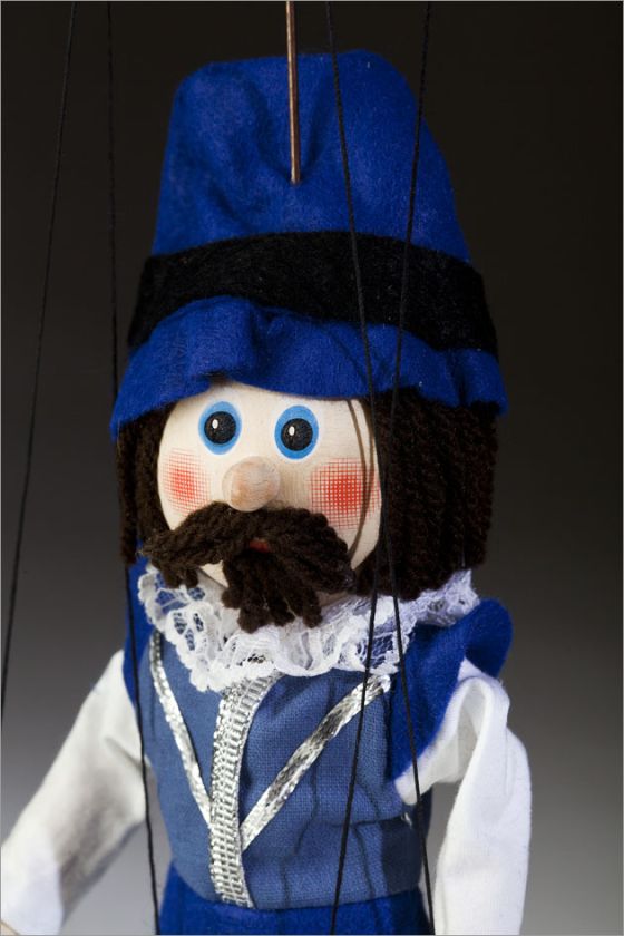 This marionette stands 8 inches tall. His beautiful blue and white costume is carefully hand-sewn as well as his hat. His face is hand-painted, his hair and moustache are wool. The body, head, hands and feet are made of wood. Includes a guiding operating device.