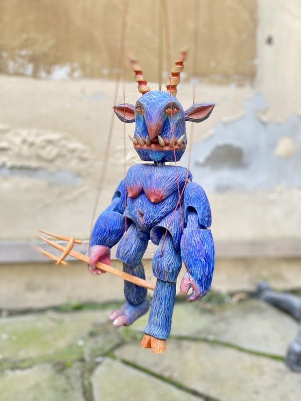 Esta marioneta está tallada a mano en madera de tilo y pintada a mano con vibrantes colores azul y púrpura. ¡Qué genial!