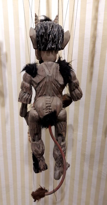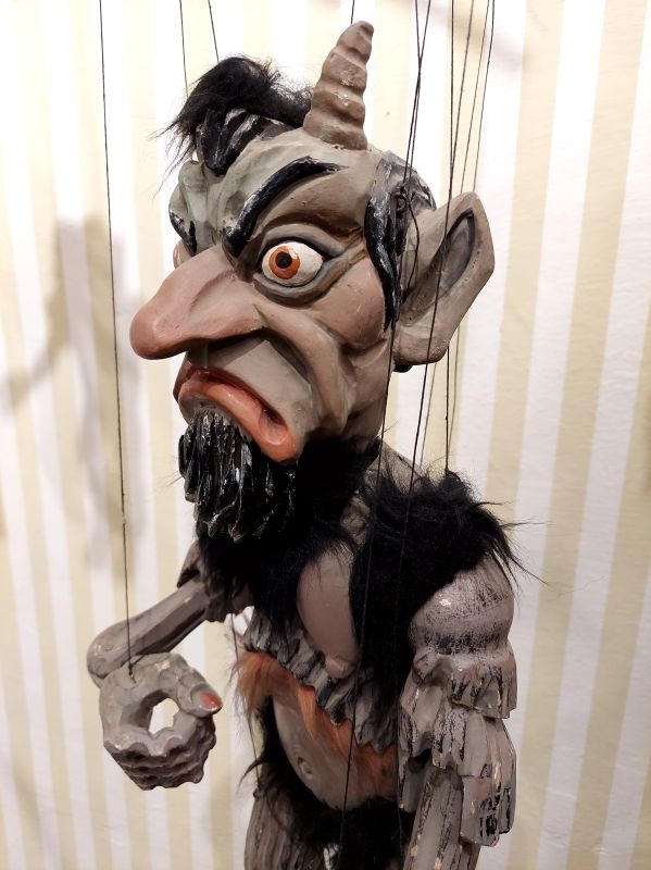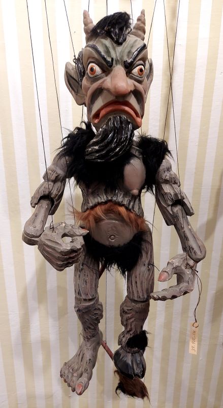 Marioneta diabólica antigua de un cuento de hadas Esta marioneta es verdaderamente única. Todo su cuerpo está tallado en detalle en madera de tilo y el único adorno textil que usa es un abrigo de piel, que pretende representar el cabello que crece por todo su cuerpo. De su cola también crece un trozo de pelo, con el que a menudo se representa al diablo. Su originalidad se ve realzada por su mandíbula móvil y sus grandes ojos saltones. En definitiva, un original que hará las delicias de cualquier aficionado a los títeres.
