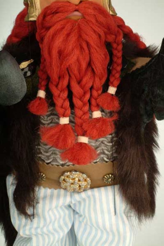 Este impresionante tipo con barba roja es absolutamente único y tiene todos los aspectos de la cultura del norte. Su traje cosido a mano consiste en una chaqueta verde oscuro, piel chaleco, pantalones de rayas azules y blancas y cinturón enorme. Lo que hace que este títere siete sea más realista es su casco dorado con cuernos dorados. Nuestro vikingo es un títere perfecto para fines de exhibición o presentaciones ocasionales.