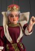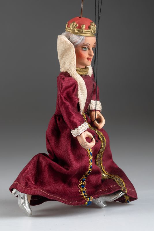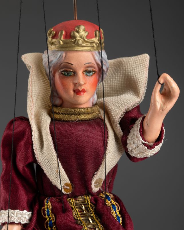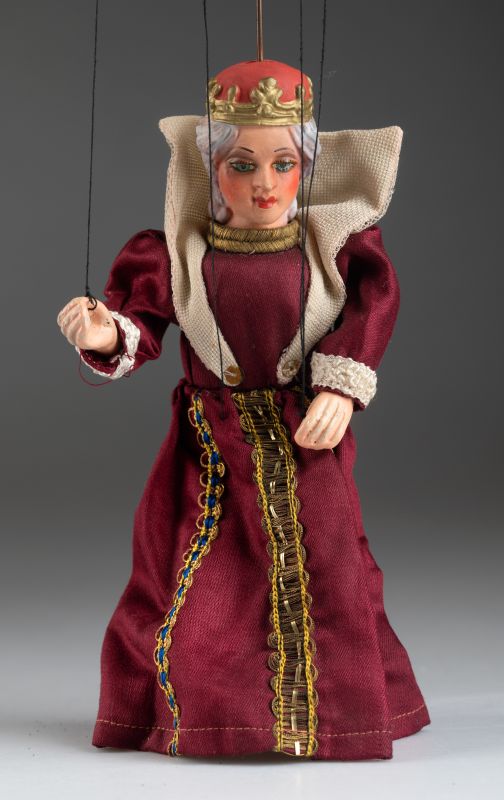 Esta marioneta antigua de reina encarna la figura noble de los cuentos y leyendas checos. Con una elegante corona, un magnífico vestido rojo oscuro adornado con detalles dorados y un distintivo collar, esta marioneta de reina irradia gracia y majestuosidad reales. Su vestimenta está meticulosamente confeccionada con materiales de calidad y embellecida con decoraciones tradicionales que le otorgan a la marioneta un auténtico aire histórico.