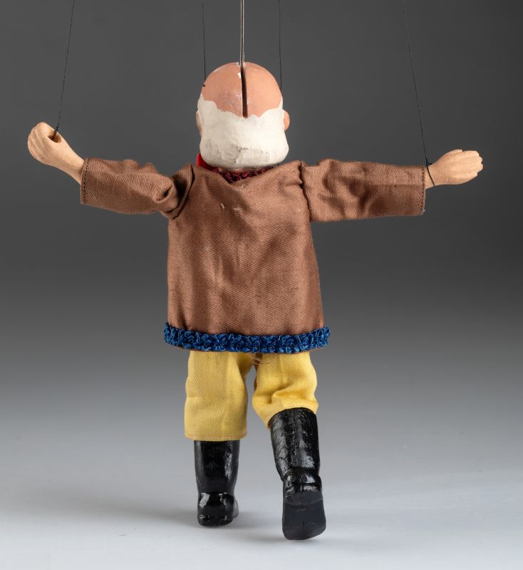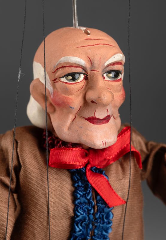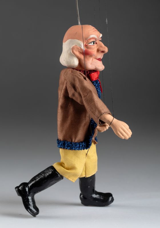 El rostro de la marioneta está cuidadosamente pintado a mano con rasgos expresivos que capturan la sabiduría y la calma de un terrateniente rural. Cada detalle ha sido creado con amor y precisión para dar vida a esta marioneta y evocar la atmósfera de la cultura popular checa.