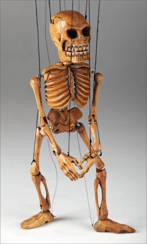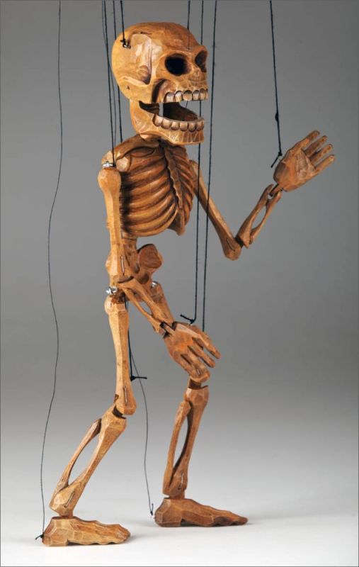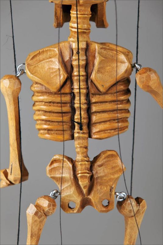 Marioneta de esqueleto de madera Nuestra marioneta Esqueleto tiene la capacidad de abrir la boca y es muy flexible. Tiene muñecas, tobillos y talones móviles. El Esqueleto Sonriente es un títere tallado a mano en madera de tilo y cada pieza de madera está cuidadosamente pintada a mano para resaltar la textura de la madera. Estamos orgullosos de tener a Smiling Skeleton en nuestra colección, es una verdadera obra maestra. Smiling Skeleton tiene una barra de control que garantiza un buen movimiento. No hace falta ser un titiritero profesional para jugar con esta preciosa marioneta, es muy fácil de controlar. El dispositivo de control del nivel de movilidad de los títeres y las marionetas se fabrica de forma tradicional en los títeres. ¿Cómo jugar con el esqueleto sonriente? \"