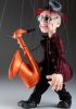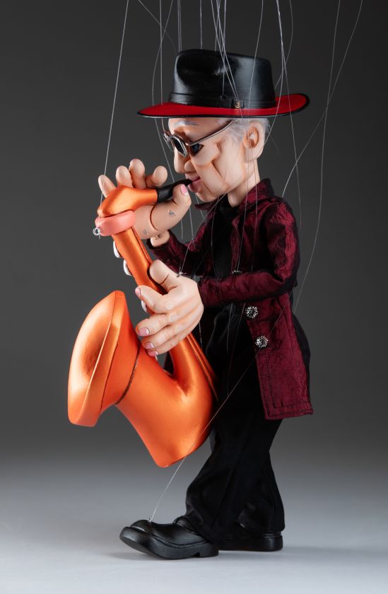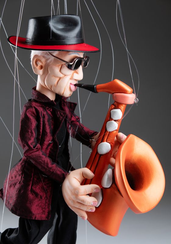 Vêtue d’un manteau texturé rouge profond, d’une tenue noire et d’un chapeau emblématique avec des lunettes élégantes, elle incarne le charme d’un véritable artiste. Son saxophone en bois détaillé ajoute une touche dynamique, faisant de cette marionnette non seulement un magnifique objet de collection, mais aussi un hommage à la culture jazz.