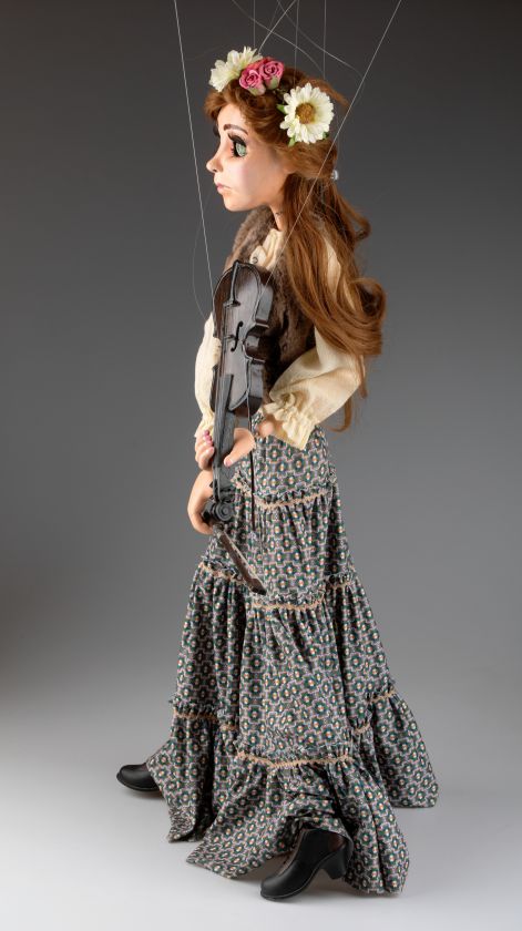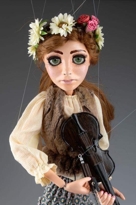 Son costume traditionnel de style folklorique, comprenant une veste détaillée et une jupe fluide à motifs, est fabriqué à partir de tissus de qualité qui se déplacent naturellement avec les gestes de la marionnette. Chaque détail, du visage peint à la main à la violon réaliste, témoigne du soin et du talent mis dans sa fabrication.