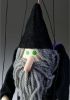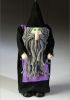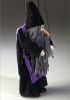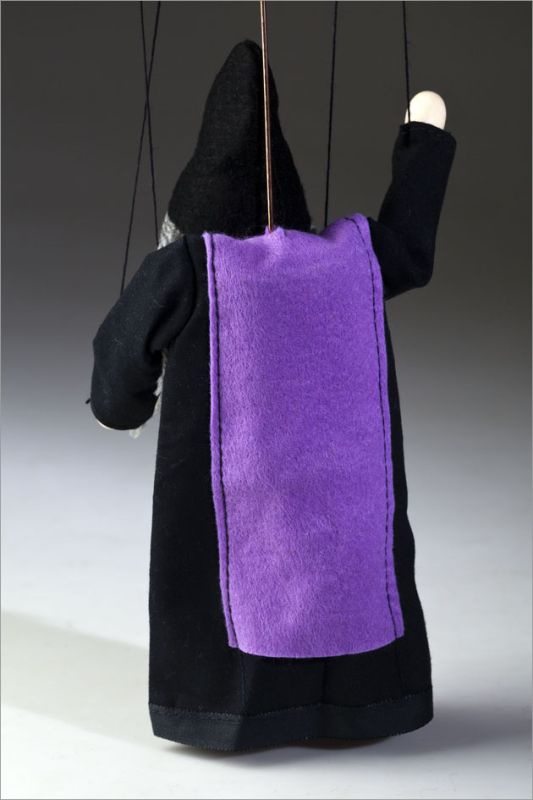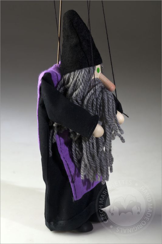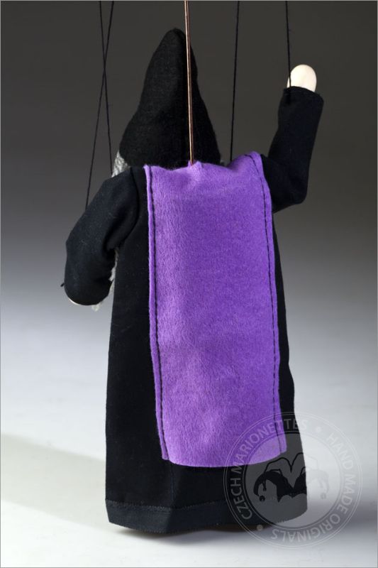 Le magicien en robe noir-violet mesure environ 20 cm de haut et est entièrement en bois. Sa robe est cousue à la main et élaborée en détail. Son visage est peint avec des couleurs non dangereuses et ses cheveux sont en laine. La marionnette a un dispositif de guidage adéquat.