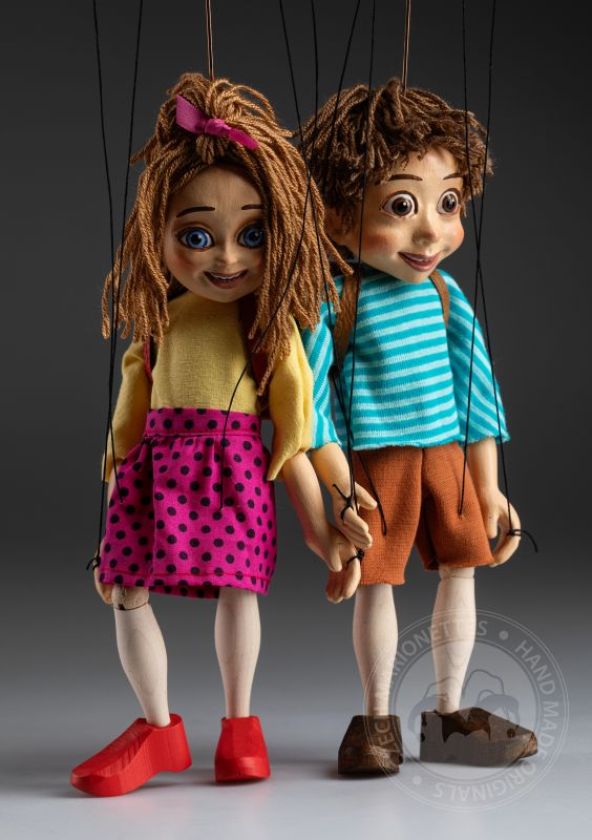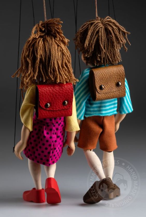 Ces deux marionnettes sont des nouvelles venues dans notre boutique. L'écolière et l'écolier sont les meilleurs amis et ils peuvent aussi être vos amis ! De belles marionnettes à fils faites à la main pour tous.