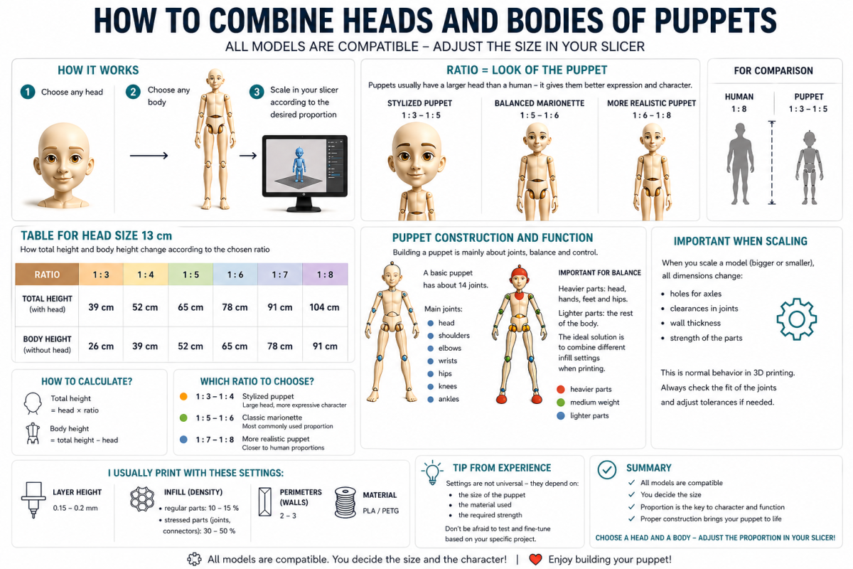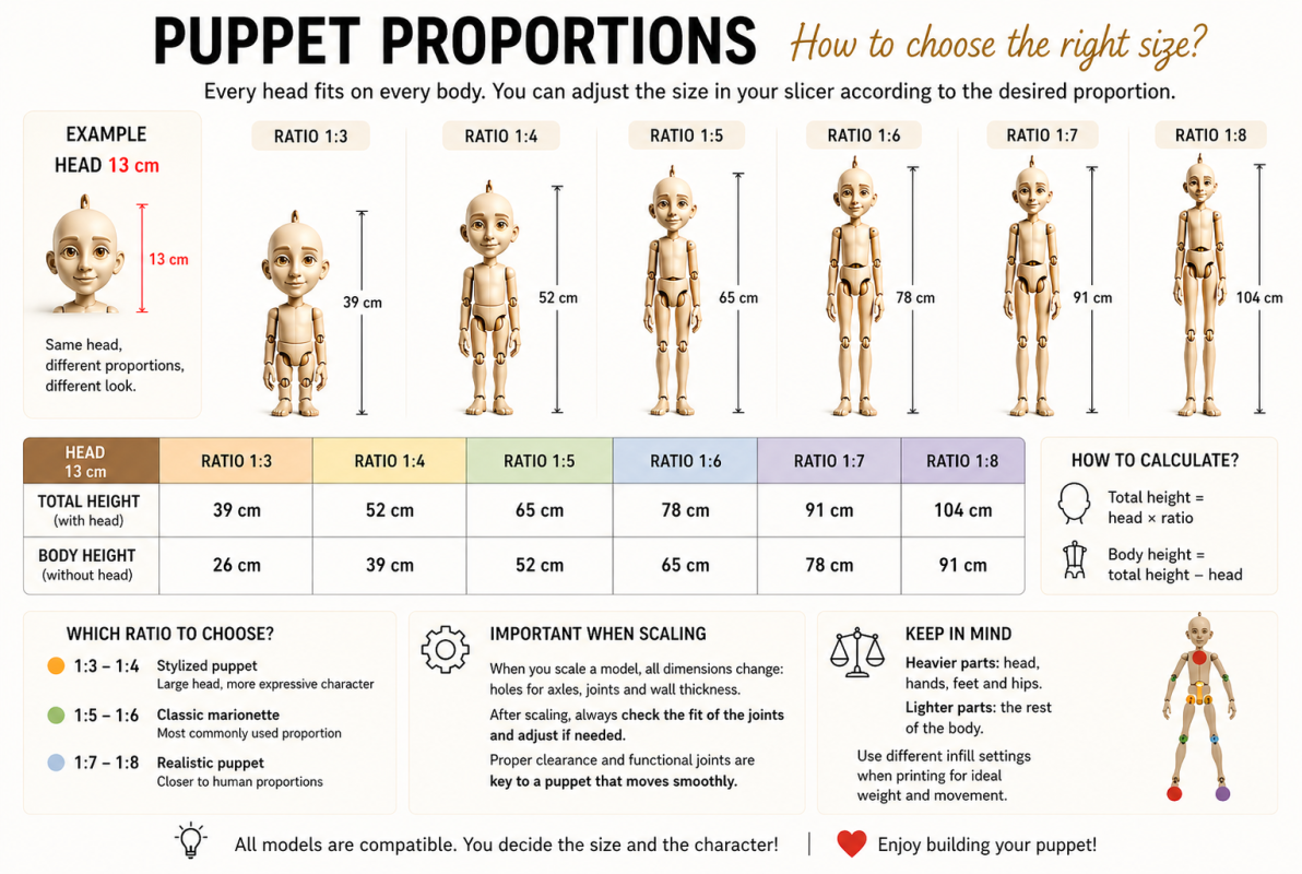 My printing setting for those parts are 20-30 % infill, 2 perimeters (bigger the marionette is less infill I use)
