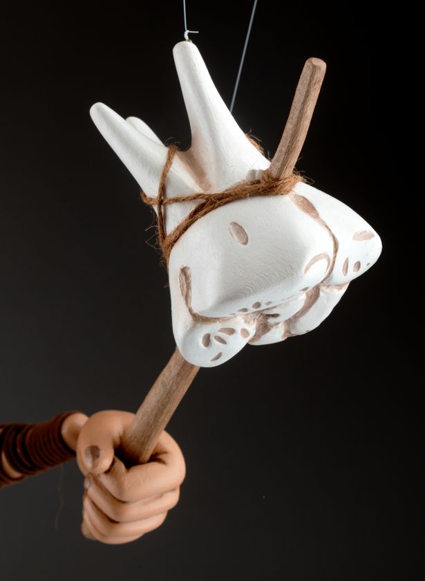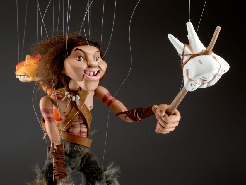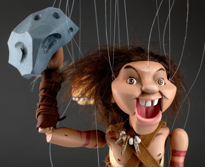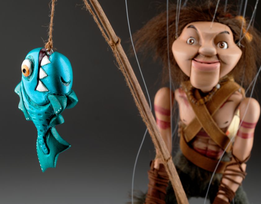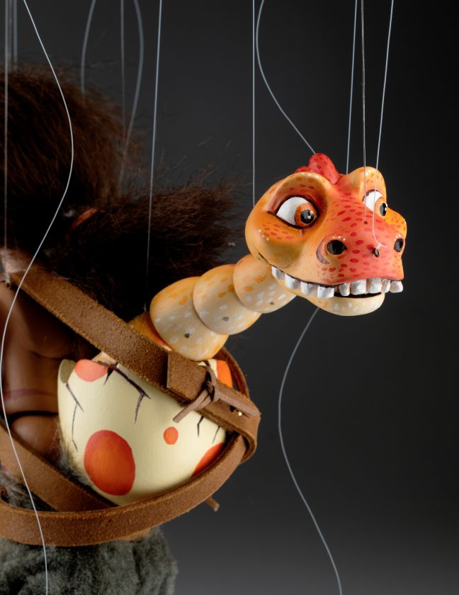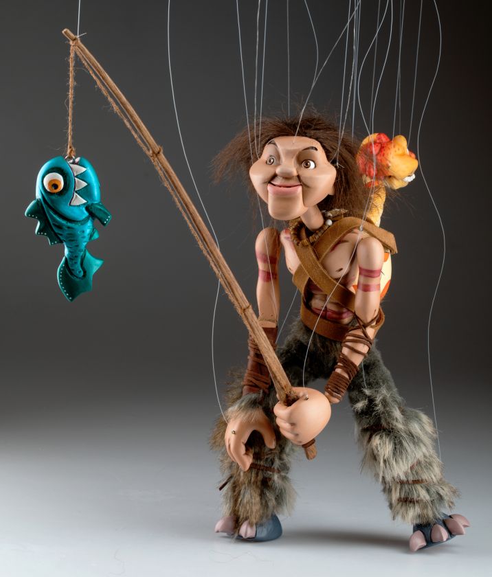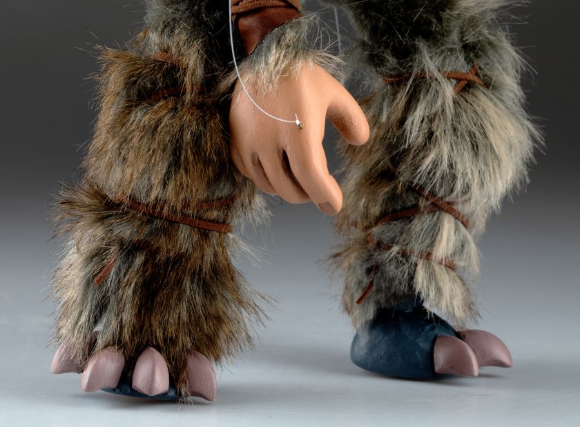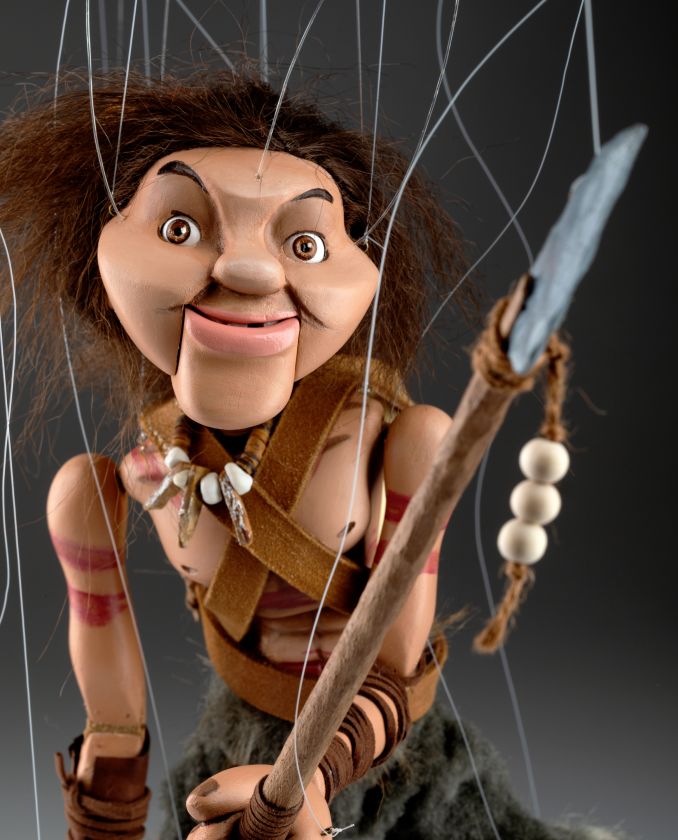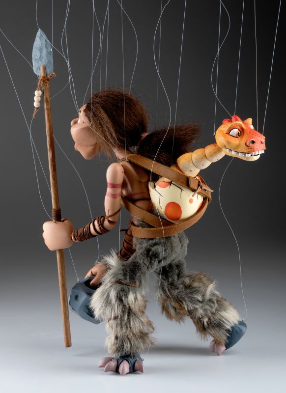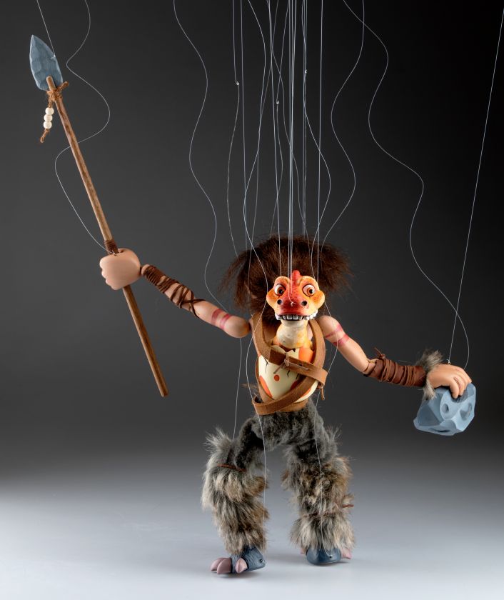 Questo uomo delle caverne porta diverse armi, come si può vedere: una lancia, una pietra, un dente gigante su un bastone, una zanna e alcuni pesci su un bastone. Il suo abbigliamento è altrettanto notevole, realizzato in cuoio, pelliccia artificiale e tessuto. Tuttavia, la parte più carina della marionetta è sicuramente un piccolo dinosauro in un uovo rotto che pende dalla schiena dell'uomo delle caverne.