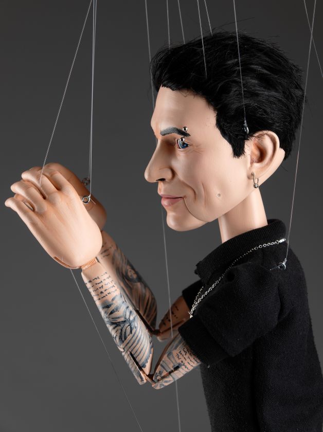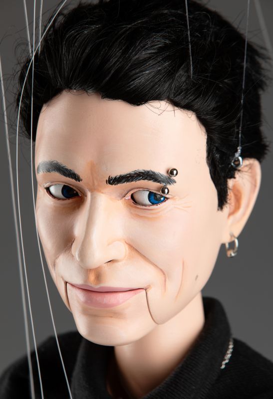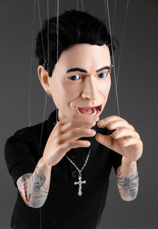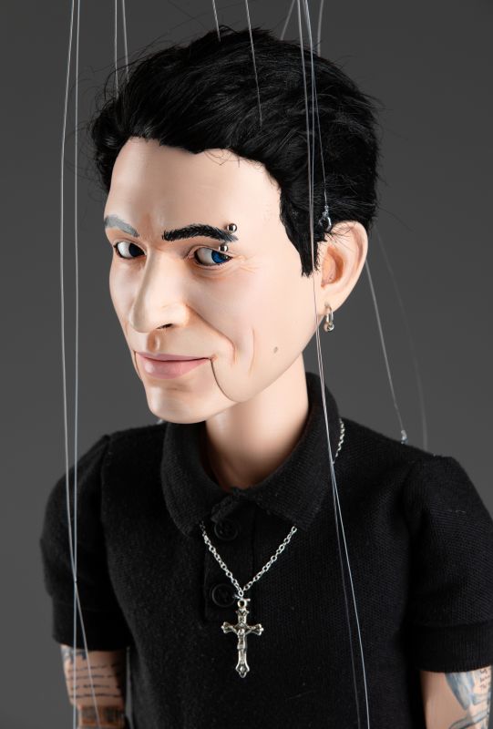 La marionetta presenta una bocca e occhi mobili, che consentono movimenti espressivi e realistici. Ogni aspetto di questa marionetta, dai lineamenti del viso ai tatuaggi, è personalizzato per riflettere accuratamente l'aspetto unico di Dylan Gemelli. È vestita con un abito elegante, che include una maglietta nera, pantaloni bianchi e scarpe da ginnastica nere, aggiungendo un aspetto realistico e contemporaneo. Una collana dettagliata aggiunge un tocco di personalità, completando lo stile distintivo della marionetta. Materiali di alta qualità garantiscono durata e una sensazione premium, rendendola perfetta sia per l'esposizione che per l'uso interattivo.