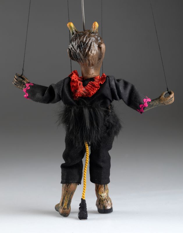 Questa marionetta del diavolo antica rappresenta un personaggio tradizionale del folclore ceco, aggiungendo un tocco mistico e un fascino unico. Il diavolo ha corna, un colletto rosso e un viso dipinto in modo marcato che accentua la sua espressione minacciosa. Il suo abito, realizzato in tessuto nero con dettagli in pelliccia, richiama la rappresentazione classica del diavolo nelle leggende popolari.