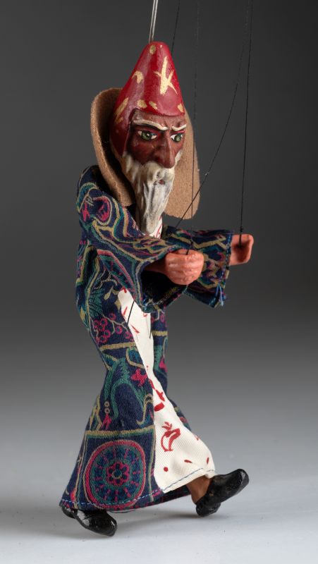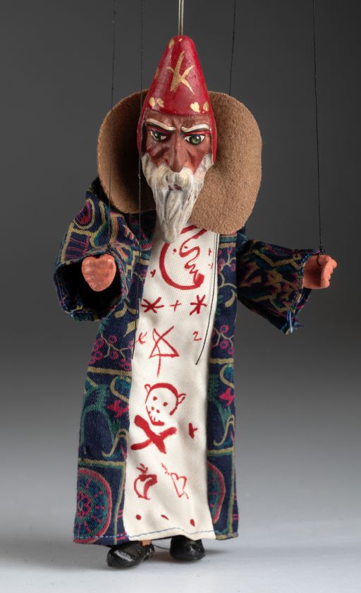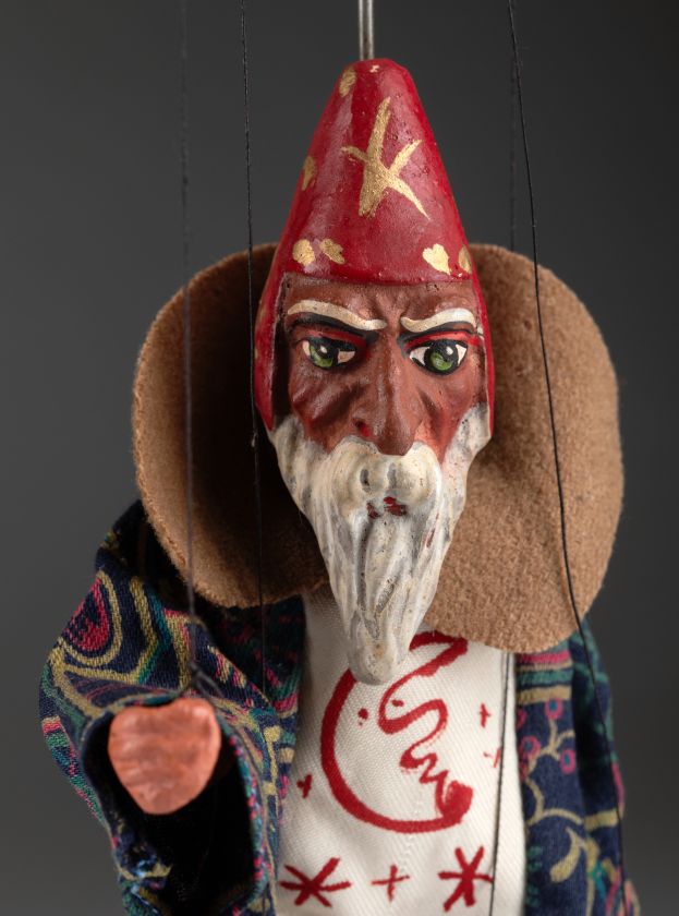 Questa marionetta di mago antico porta misticismo e magia nel mondo del teatro delle marionette ceco. Con il suo caratteristico cappello rosso adornato da simboli dorati e un viso saggio con una lunga barba bianca, questa marionetta incarna l'archetipo del mago delle fiabe e delle leggende. Vestito con un mantello decorato con motivi misteriosi, enfatizza la sua aura magica.
