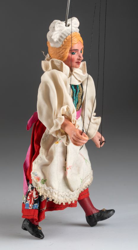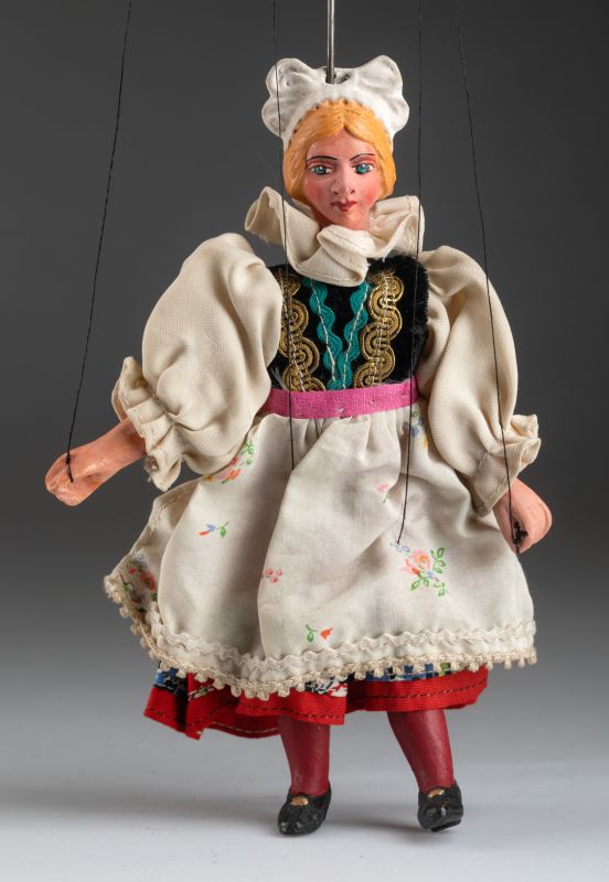 Questa marionetta antica rappresenta un pezzo unico della cultura popolare ceca. Vestita con un costume tradizionale realizzato con cura, la marionetta riflette la ricca storia e le tradizioni delle campagne ceche. Con una delicata pittura facciale che cattura la sua espressione dolce e un abito progettato meticolosamente con motivi floreali e dettagli in pizzo, la marionetta emana autenticità ed eleganza.