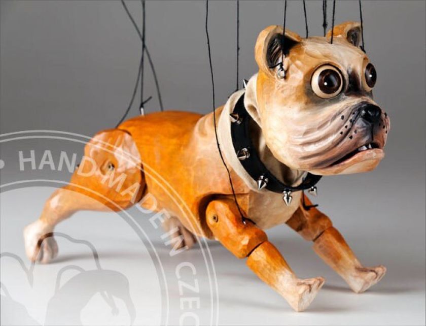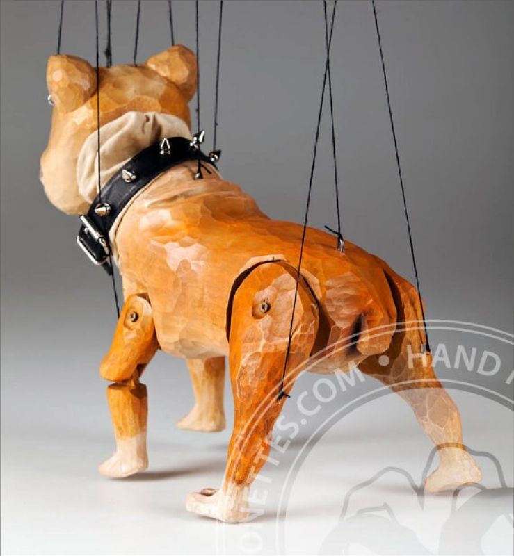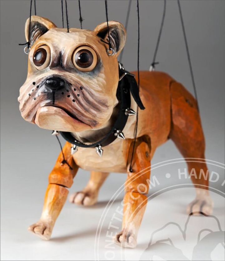 Ogni parte di questa marionetta è scolpita a mano dal legno di tiglio e successivamente dipinta a mano con cura. Ha una bocca e occhi mobili, e il suo collo è decorato con un collare. Questa marionetta è una vera opera d'arte. Anche se il bulldog è molto realistico, si può ancora vedere la struttura del legno.
