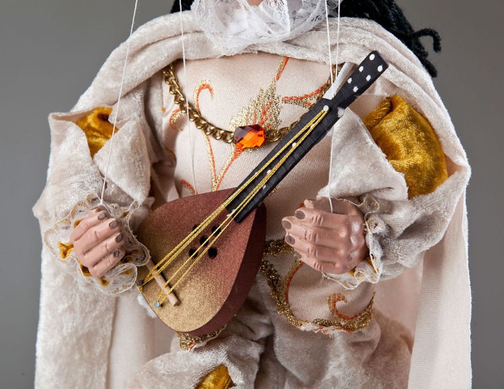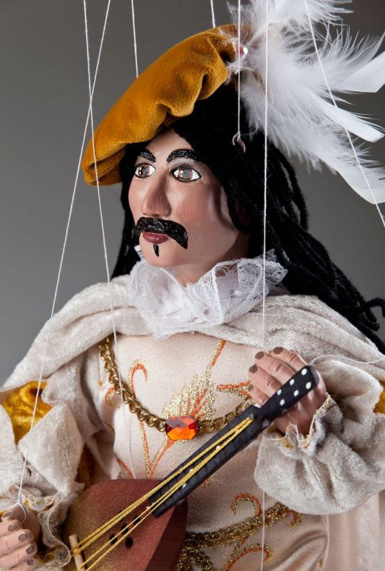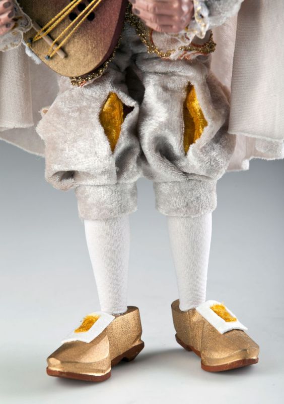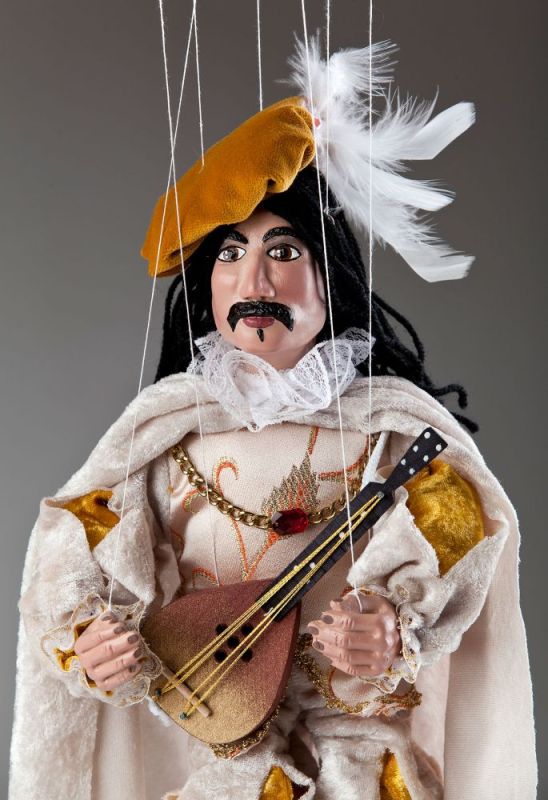 Questa marionetta è un altro capolavoro della Collezione Corte Reale delle Marionette Ceche. Guarda questo affascinante suonatore di ukulele! Chi non vorrebbe ascoltare una canzone suonata da lui? Il suo abbigliamento indica che è un uomo benestante. Indossa pantaloncini di velluto beige chiaro, camicia con maniche ampie e bellissimi ricami dorati. L'intero abito si abbina al suo mantello e alle scarpe dorate. Accessori come l'ukulele, la catena dorata al collo e il cappello con piuma lo rendono ancora più speciale.