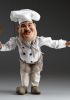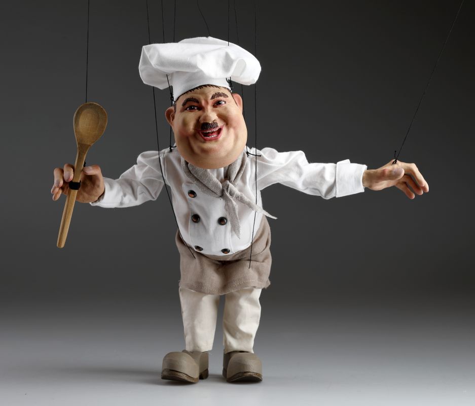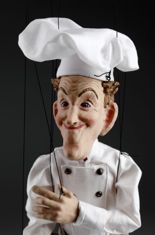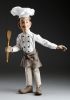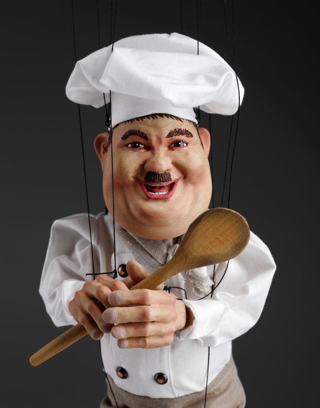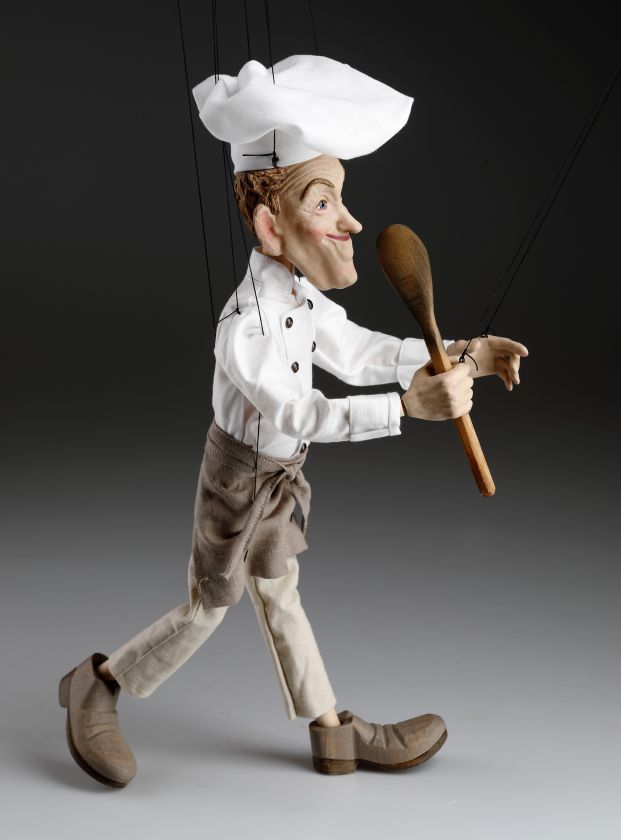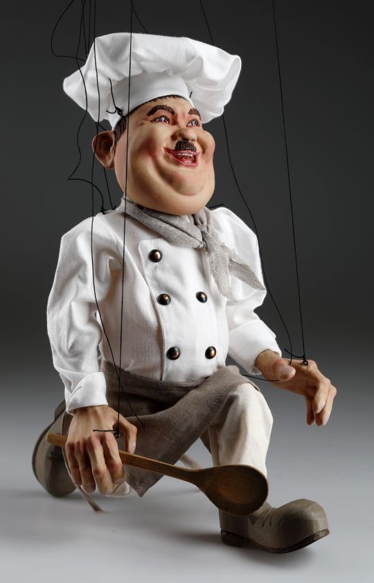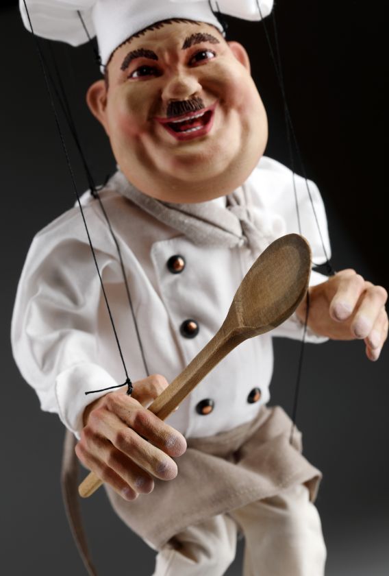 Notare l'abbigliamento ben fatto e le espressioni benevole sui volti di entrambi gli chef. Gli scheletri dei burattini sono in legno, le teste e le mani sono realizzate in resina non pericolosa e molto resistente, le scarpe sono in legno. Tutto è dipinto a mano e patinato. I pupazzi hanno controlli classici, una gamma di movimento molto decente e imparerai a giocarci in pochi istanti.
