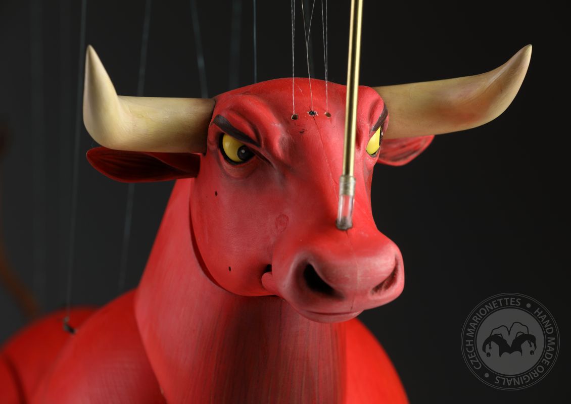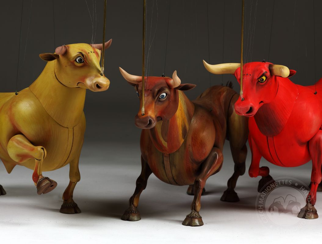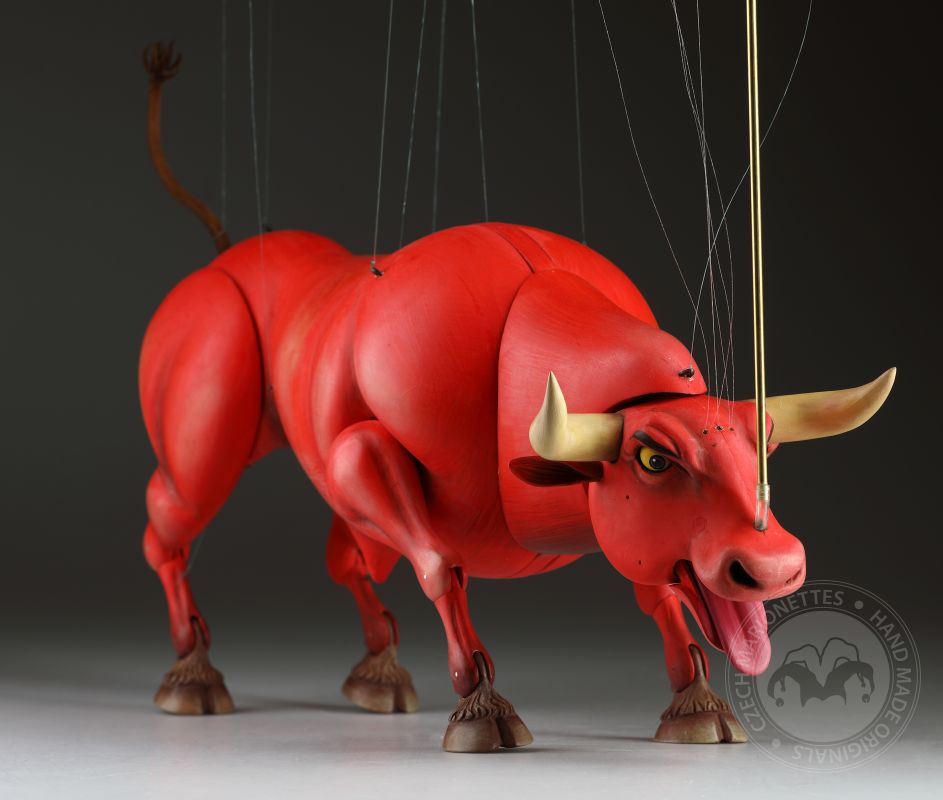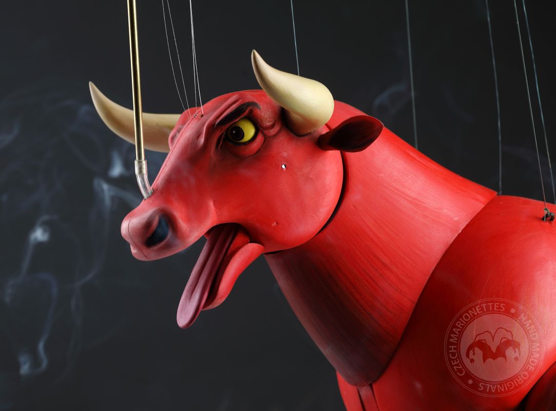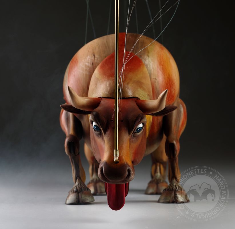 Guardando queste marionette, si può percepire la potenza e la bellezza che questi burattini animali trasmettono. Ricordano l'atmosfera della calda Spagna, la sua passione, i suoi colori vivaci e il suono della chitarra spagnola. Occhi selvaggi, corpo muscoloso e gambe eleganti rendono questi tori una vera opera d'arte. Ogni singolo dettaglio è intagliato e dipinto a mano. Le marionette hanno la capacità di soffiare fumo o vapore attraverso le narici e di tirare fuori la lingua, rendendole ancora più realistiche. È un vero piacere maneggiarle. Il dispositivo di controllo è rotativo, quindi esibirsi con queste marionette di tori raggiunge un livello professionale altissimo.