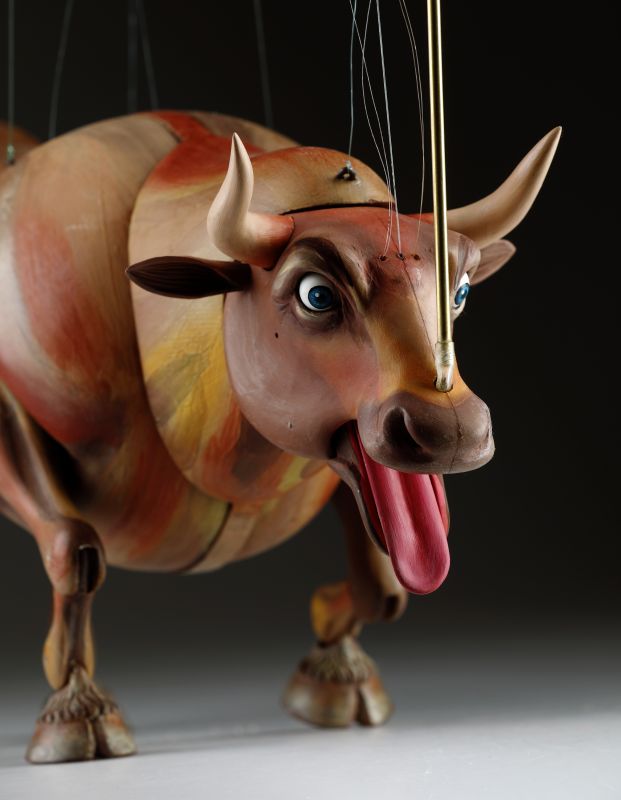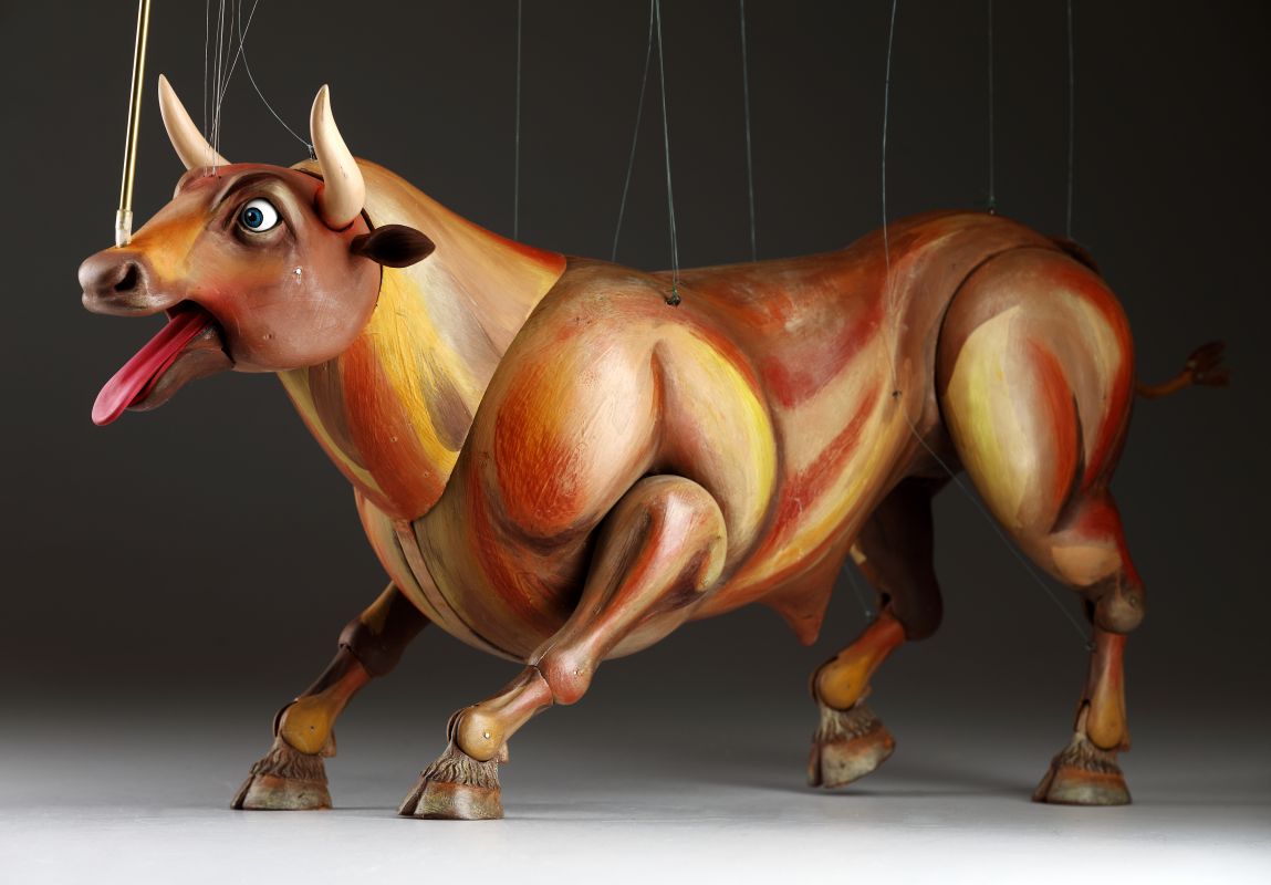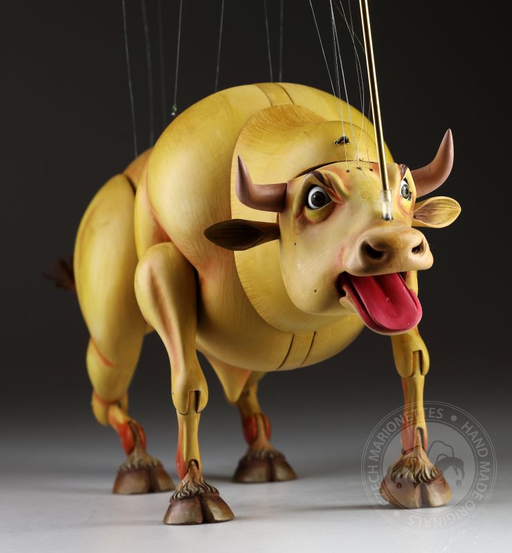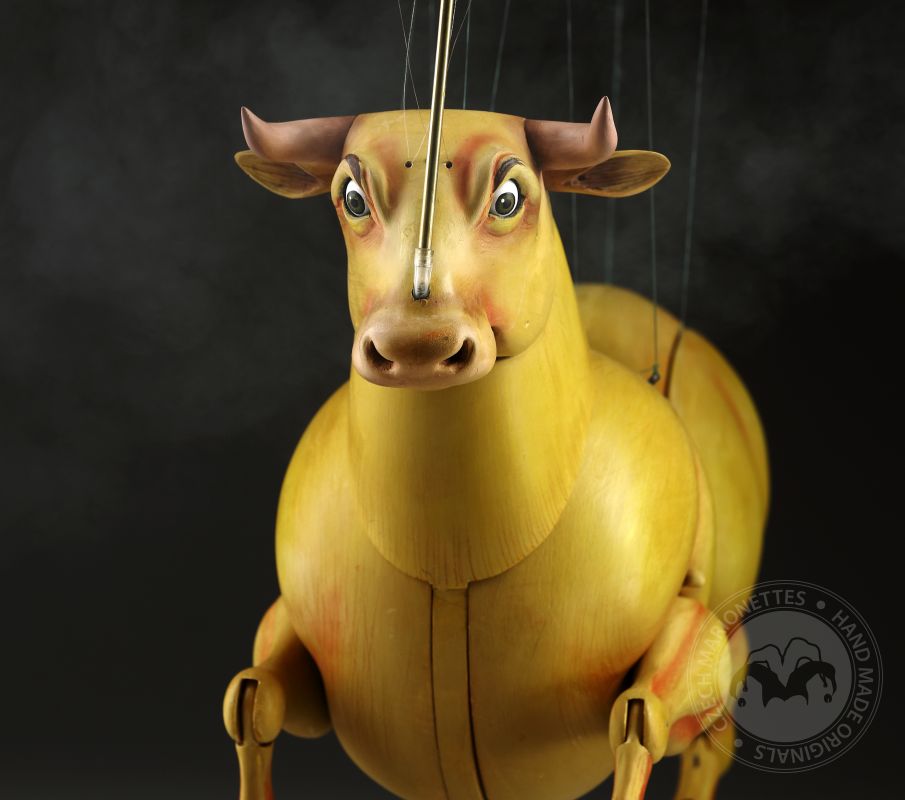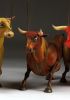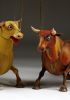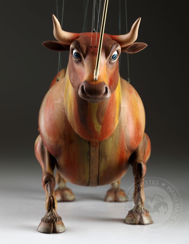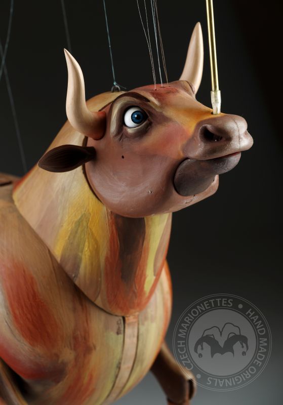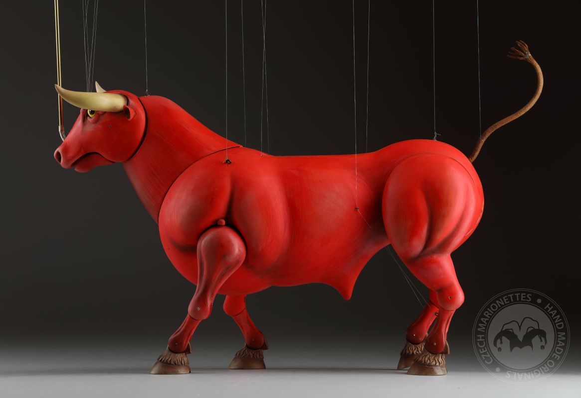 Guardando queste marionette, si può percepire la potenza e la bellezza che questi burattini animali trasmettono. Ricordano l'atmosfera della calda Spagna, la sua passione, i suoi colori vivaci e il suono della chitarra spagnola. Occhi selvaggi, corpo muscoloso e gambe eleganti rendono questi tori una vera opera d'arte. Ogni singolo dettaglio è intagliato e dipinto a mano. Le marionette hanno la capacità di soffiare fumo o vapore attraverso le narici e di tirare fuori la lingua, rendendole ancora più realistiche. È un vero piacere maneggiarle. Il dispositivo di controllo è rotativo, quindi esibirsi con queste marionette di tori raggiunge un livello professionale altissimo.