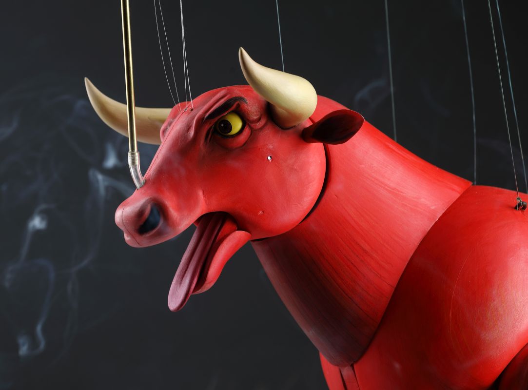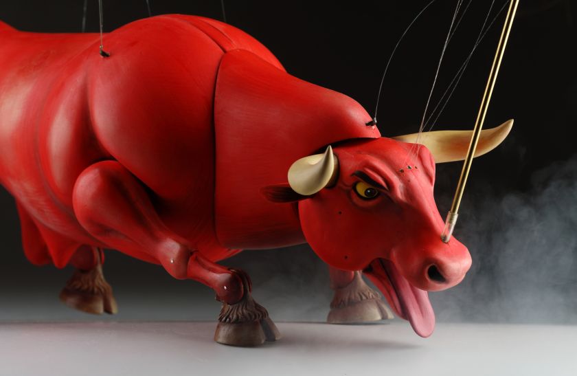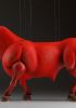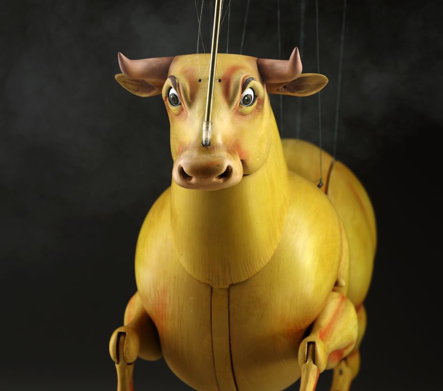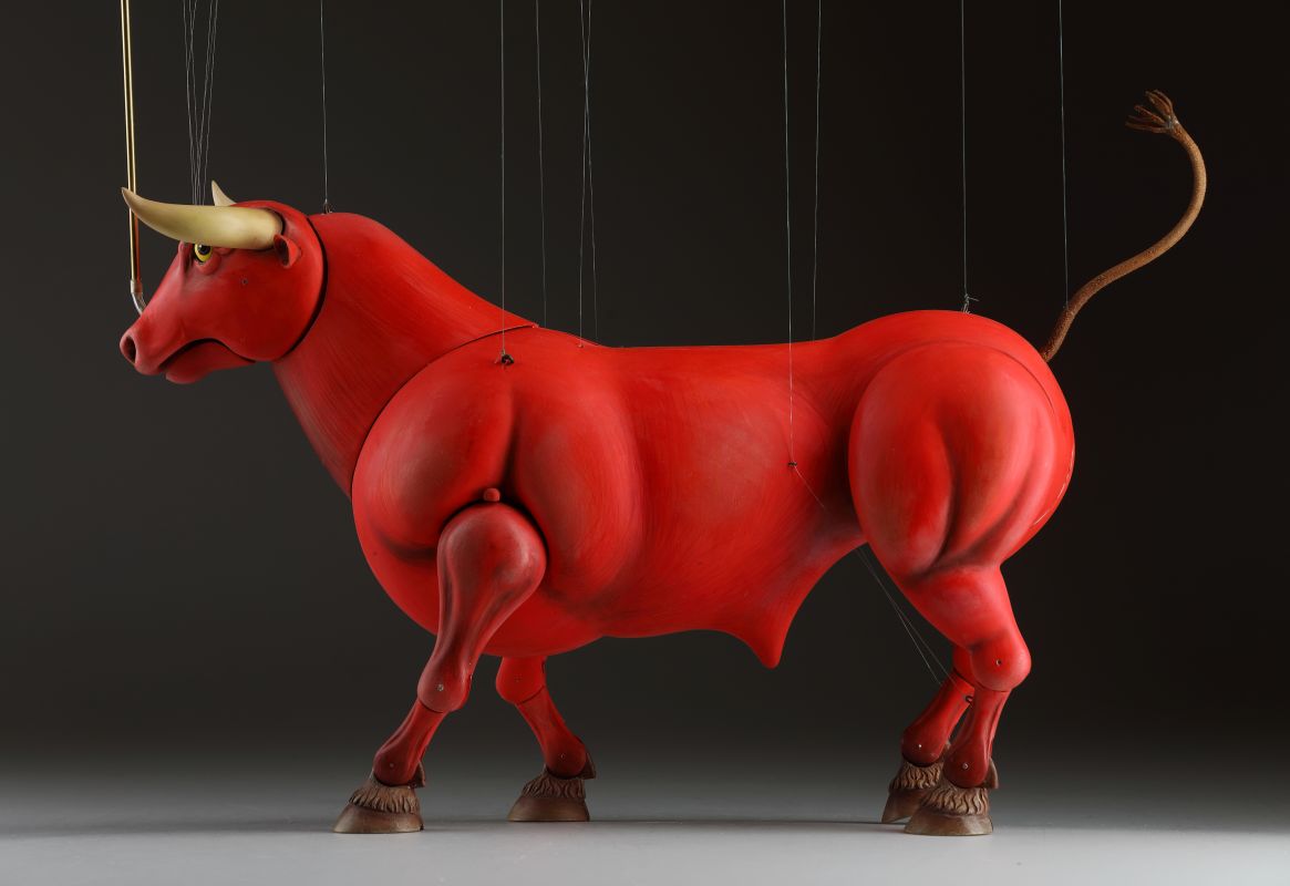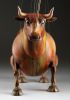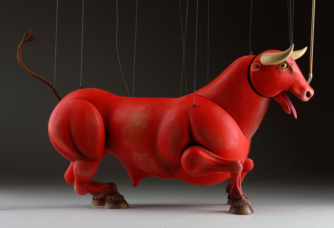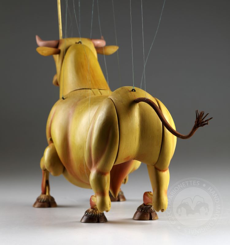 Guardando queste marionette, si può percepire la potenza e la bellezza che questi burattini animali trasmettono. Ricordano l'atmosfera della calda Spagna, la sua passione, i suoi colori vivaci e il suono della chitarra spagnola. Occhi selvaggi, corpo muscoloso e gambe eleganti rendono questi tori una vera opera d'arte. Ogni singolo dettaglio è intagliato e dipinto a mano. Le marionette hanno la capacità di soffiare fumo o vapore attraverso le narici e di tirare fuori la lingua, rendendole ancora più realistiche. È un vero piacere maneggiarle. Il dispositivo di controllo è rotativo, quindi esibirsi con queste marionette di tori raggiunge un livello professionale altissimo.